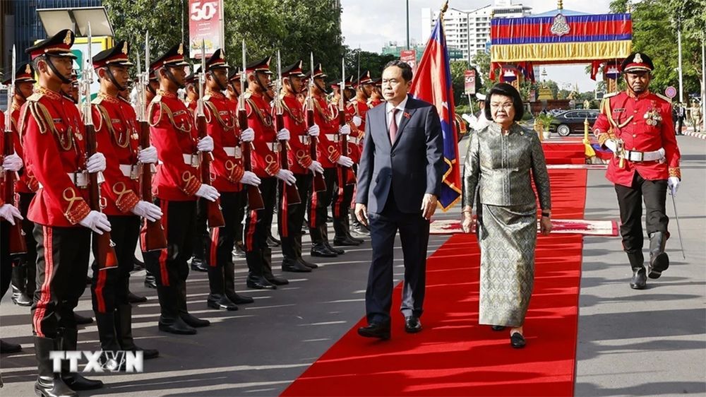 柬埔寨国会主席昆索达莉亲王为越南国会主席陈青敏举行的欢迎仪式。(图片来源:越通社)