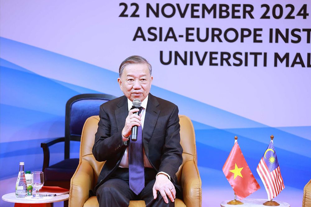 Le secrétaire général du PCV To Lam prononce un discours marquant à l’Université de Malaisie. Photo : VNA.