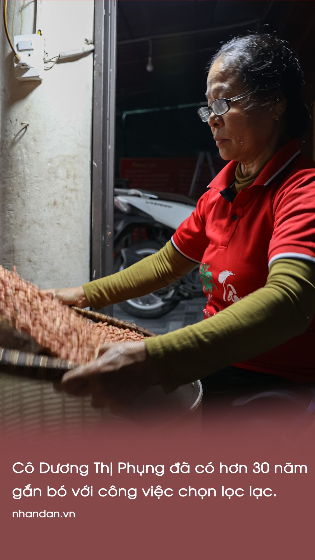 “Làm công việc này 33 năm rồi, nhiều khi tôi cũng muốn đổi vị trí, nhưng không ai làm tốt hơn mình, để người khác nhặt tôi không yên tâm, rồi lại phải lựa lại. Lạc là nguyên liệu rất quan trọng để làm kẹo cu đơ, lạc có chuẩn, kẹo mới ngon được.