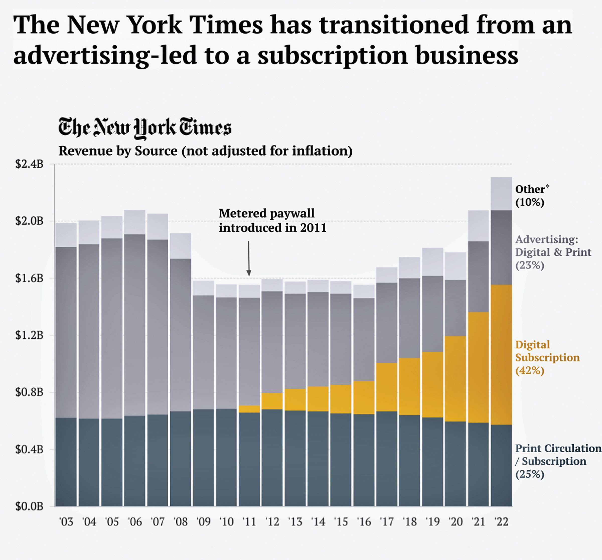 Phân bổ nguồn thu của New York Times năm 2022: 25% từ báo in, 42% từ thu phí, 23% từ quảng cáo và 10% khác. Nguồn: NYT