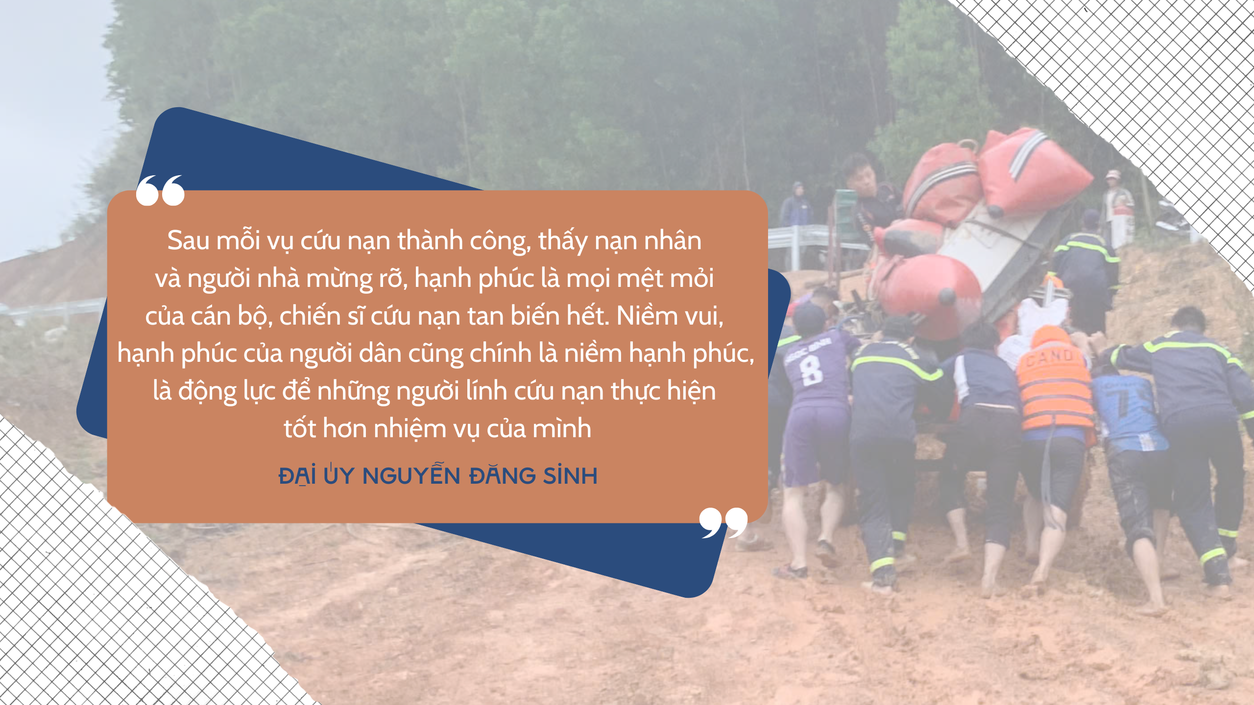 “Sau mỗi vụ cứu nạn thành công, thấy nạn nhân và người nhà mừng rỡ, hạnh phúc là mọi mệt mỏi của cán bộ, chiến sĩ cứu nạn tan biến hết. Niềm vui, hạnh phúc của người dân cũng chính là niềm hạnh phúc, là động lực để những người lính cứu nạn thực hiện tốt hơn nhiệm vụ của mình”, Đại úy Nguyễn Đăng Sinh chia sẻ.
