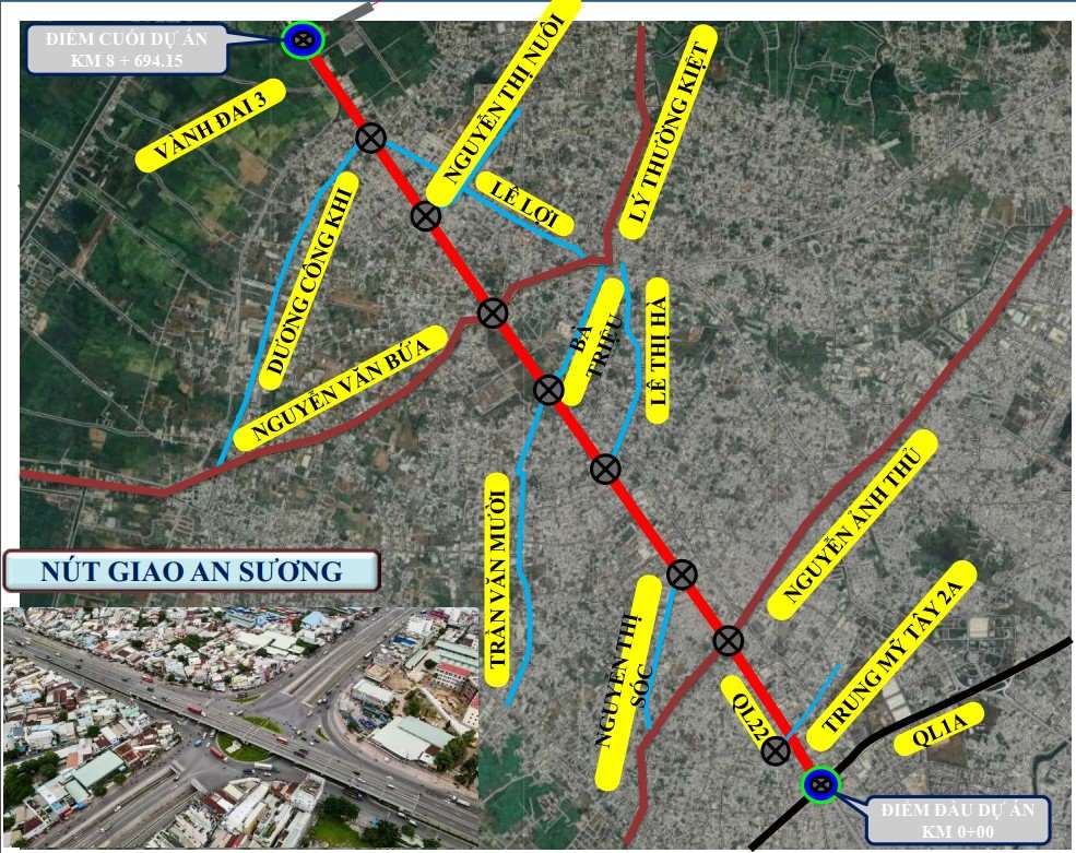 Tương tự, dự án nâng cấp, cải tạo Quốc lộ 22 (đoạn từ nút giao An Sương đến đường Vành đai 3) có chiều dài khoảng 8 km, đi qua địa bàn khu vực huyện Hóc Môn và Củ Chi cũ có vốn đầu tư khoảng 10.400 tỷ đồng, sau khi nâng cấp sẽ mở rộng lên 60 m, bố trí 10 làn xe. Trên toàn tuyến, 7 cầu vượt sẽ được xây dựng tại các nút giao trọng điểm gồm Nguyễn Ảnh Thủ, Nguyễn Thị Sóc-Nhà Vuông, Lê Thị Hà, Trần Văn Mười-Bà Triệu, Lý Thường Kiệt-Nguyễn Văn Bứa, Nguyễn Thị Nuôi và Dương Công Khi-Lê Lợi.