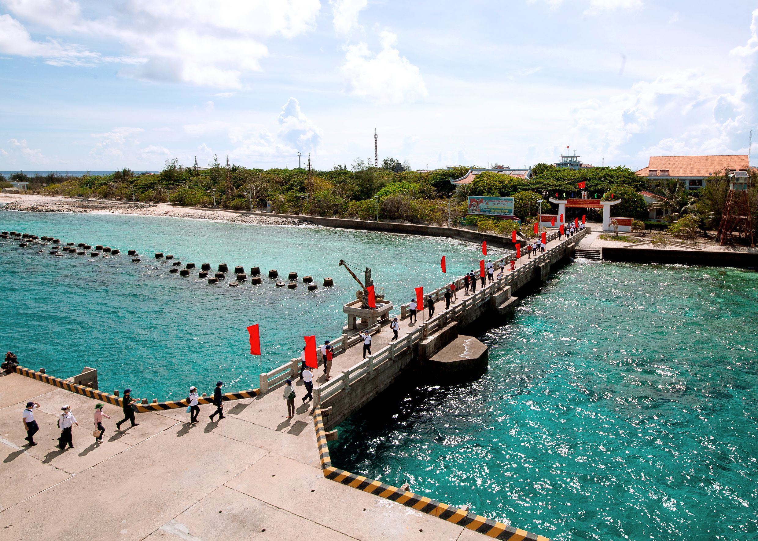Xa xa, Trường Sa Lớn tựa 1 pháo đài vững chắc giữa Biển Đông. Chiếc cầu cảng dài 150m như cánh tay vạm vỡ dang rộng nối tàu đưa đoàn công tác lên đảo. “Thủ đô” của quần đảo được thiên nhiên ưu đãi với nguồn nước ngọt dồi dào hơn cả và cũng là đảo duy nhất có cầu cảng để tàu có thể cập.