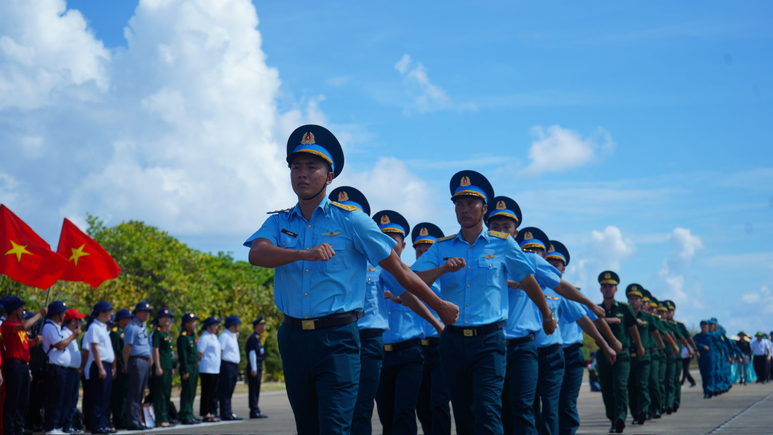 Đi hết cầu cảng là tới cổng chính dẫn vào đảo Trường Sa Lớn. Hai hàng cây bàng vuông xanh tươi uốn mình kết thành cổng chào dài cả trăm mét đón người từ đất liền ghé thăm. Sau những cái bắt tay vội, các đại biểu rảo bước chân, tiến về phía đường băng để tham gia nghi thức đặc biệt: Lễ chào cờ và duyệt đội hình đội ngũ.