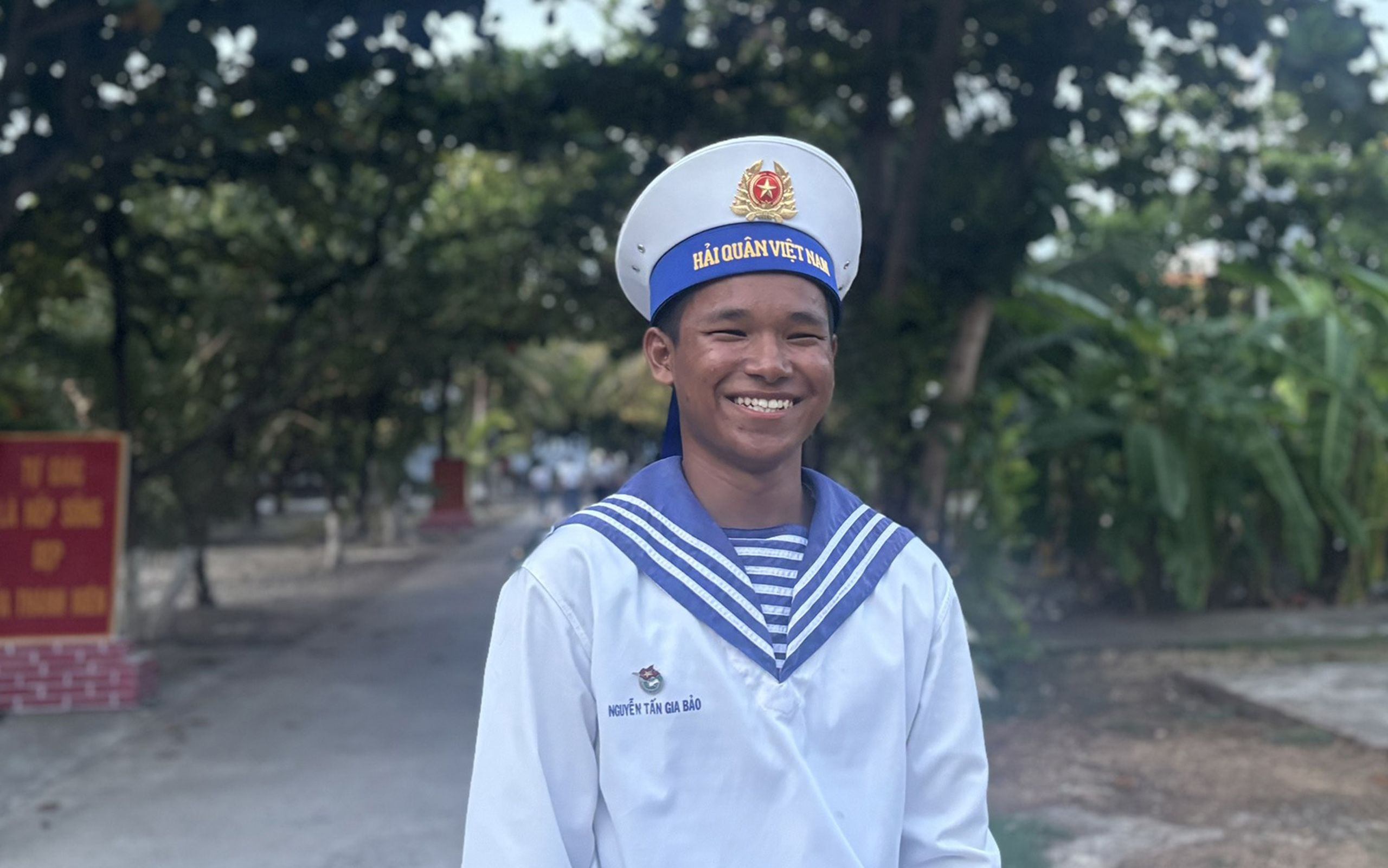 Cầm chùm sơn tra vừa hái tặng khách phương xa, Nguyễn Tấn Gia Bảo, chàng lính trẻ sinh năm 2004 chia sẻ, em vui và tự hào khi trong xã chỉ có mình mình được trở thành lính Trường Sa. Hơn 5 tháng làm lính đảo, làn da vốn đen của Bảo nay càng đậm màu nắng gió Biển Đông. Bảo “đen” cho biết, với sự quan tâm của nhân dân cả nước, Trường Sa hôm nay đã có cơ sở hạ tầng khang trang, hiện đại, đời sống của nhân dân, cán bộ, chiến sĩ ngày càng cải thiện. Bảo yêu không gian xanh mướt, yên bình nơi đây.