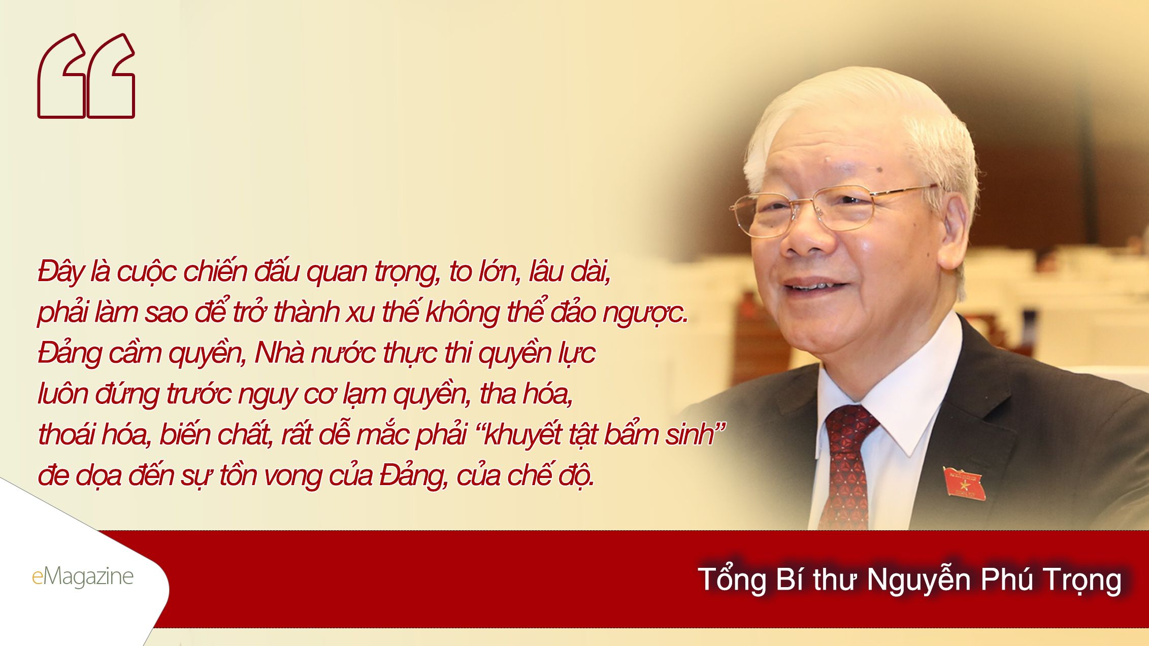 Tổng Bí thư khẳng định: Đây là cuộc chiến đấu quan trọng, to lớn, lâu dài, phải làm sao để trở thành xu thế không thể đảo ngược. Đảng cầm quyền, Nhà nước thực thi quyền lực luôn đứng trước nguy cơ lạm quyền, tha hóa, thoái hóa, biến chất, rất dễ mắc phải “khuyết tật bẩm sinh” đe dọa đến sự tồn vong của Đảng, của chế độ. Đấu tranh phòng, chống tham nhũng, tiêu cực là vấn đề hết sức quan trọng, cấp bách trong xây dựng, chỉnh đốn Đảng và cả hệ thống chính trị, được đông đảo cán bộ, đảng viên, nhân dân đánh giá cao, được nhiều chính khách và học giả quốc tế ghi nhận.