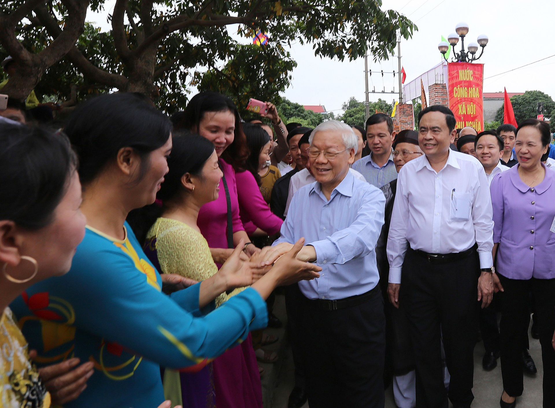 Người dân làng văn hóa Thượng Điện, thành phố Hải Phòng đón Tổng Bí thư Nguyễn Phú Trọng về dự và chung vui Ngày hội đại đoàn kết toàn dân tộc, tháng 11-2017. Ảnh: TTXVN