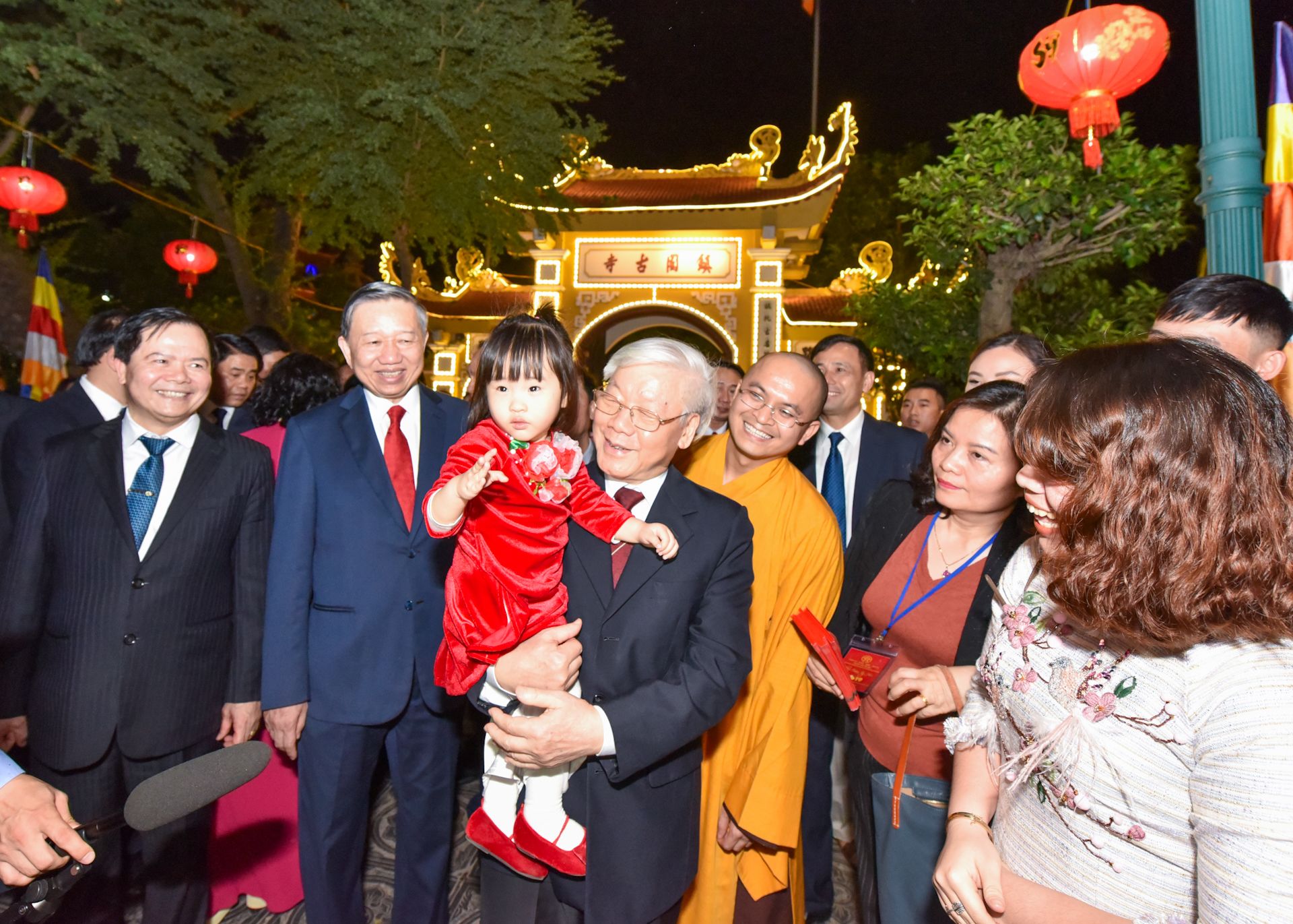 Tổng Bí thư, Chủ tịch nước Nguyễn Phú Trọng với người dân Thủ đô trong đêm Giao thừa tại chùa Trấn Quốc. Ảnh: DUY LINH