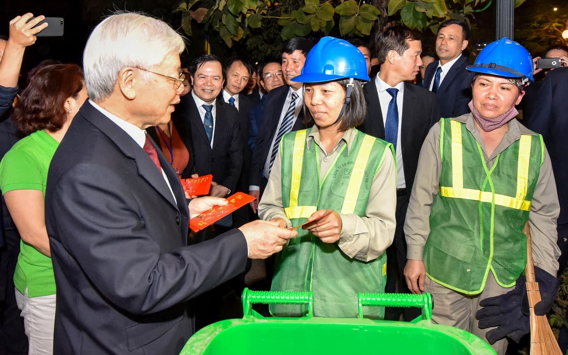 Tổng Bí thư ân cần thăm hỏi, chuyện trò và chúc Tết công nhân Công ty Công viên cây xanh Hà Nội đang làm việc trong đêm Giao thừa. Ảnh: DUY LINH