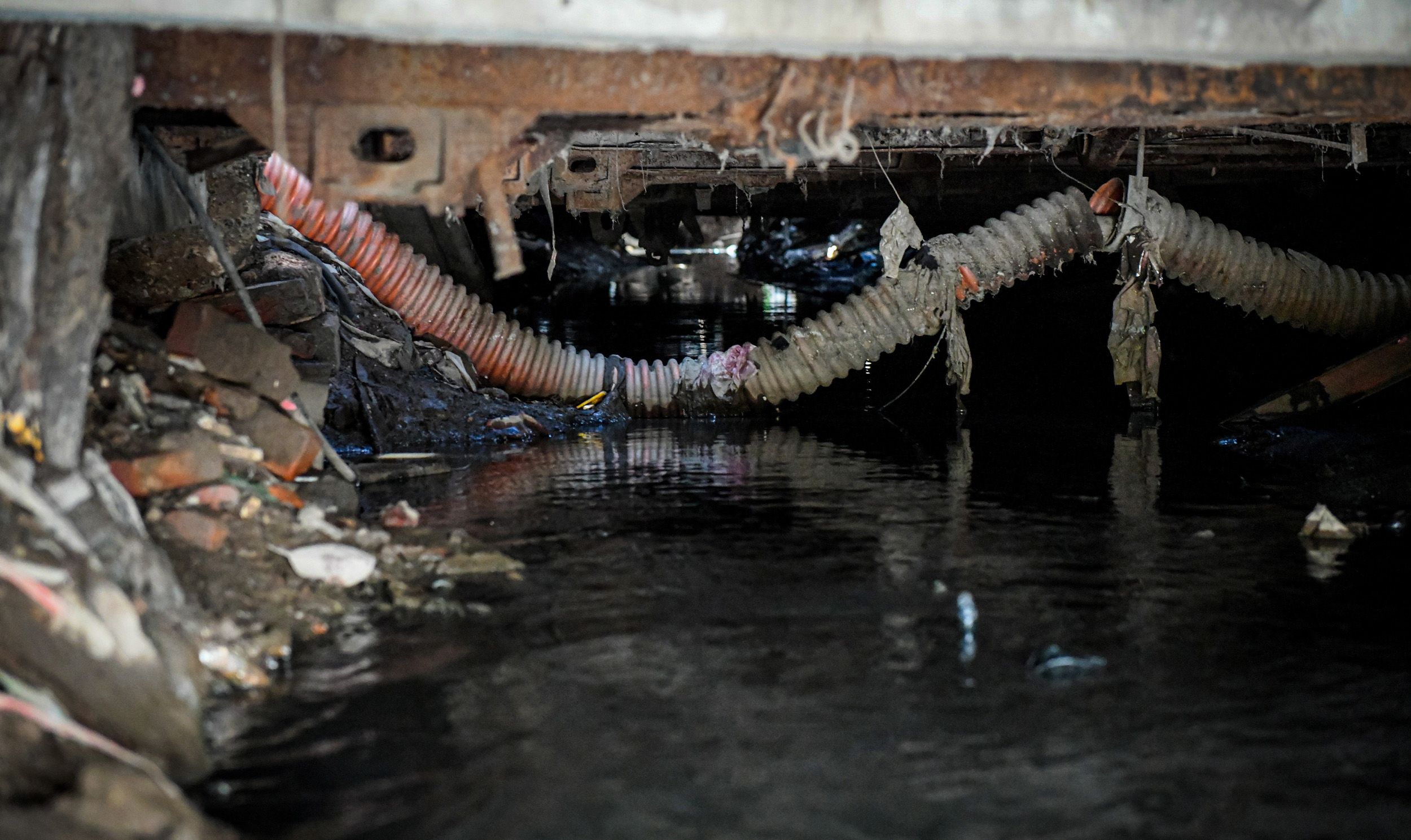 Nói đoạn, ông chỉ tay về phía trước cho chúng tôi thấy một ống cáp viễn thông hạ ngầm đang võng hẳn xuống mặt nước. Rác thải sinh hoạt, xà gồ, lá cây… đã mắc kín lại, cản trở toàn bộ hệ thống thoát. Tứ phía rong rêu ẩm ướt. Từng đàn gián, côn trùng thấy bóng người chạy ngược vào các khe hở, tiếng chuột kêu chút chít, tiếng nước thải rả rích nhỏ giọt xuống đầu chúng tôi…