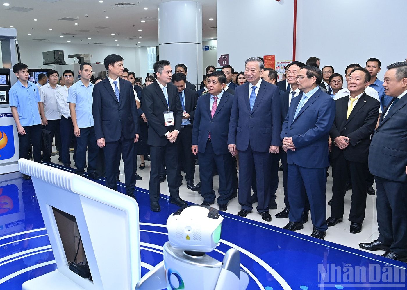 Tổng Bí thư Tô Lâm và Thủ tướng Phạm Minh Chính tham quan triển lãm về đổi mới sáng tạo, trong khuôn khổ Ngày hội Đổi mới sáng tạo quốc gia năm 2025, ngày 1/10/2025. (Ảnh: Báo Nhân Dân)