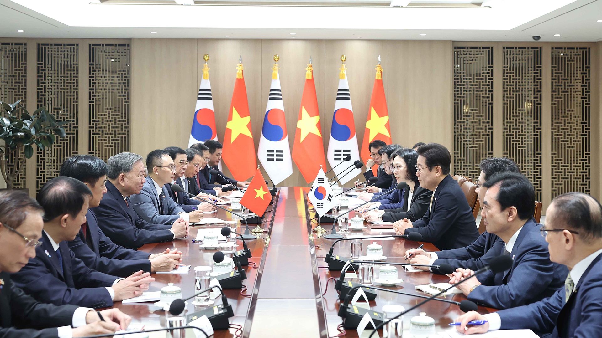 En la conversación de alto nivel con el presidente surcoreano, Lee Jae-myung, el secretario general del PCV, To Lam, expresó su aprecio por la invitación extendida por el mandatario surcoreano a él, a su esposa y a la delegación de alto nivel de Vietnam para visitar Corea del Sur inmediatamente después de asumir el cargo, lo que refleja la gran importancia y alta prioridad que Corea del Sur concede a Vietnam, así como a la Asociación Estratégica Integral binacional. To Lam reafirmó que Vietnam otorga una permanente importancia a sus lazos con Corea del Sur en su política exterior.