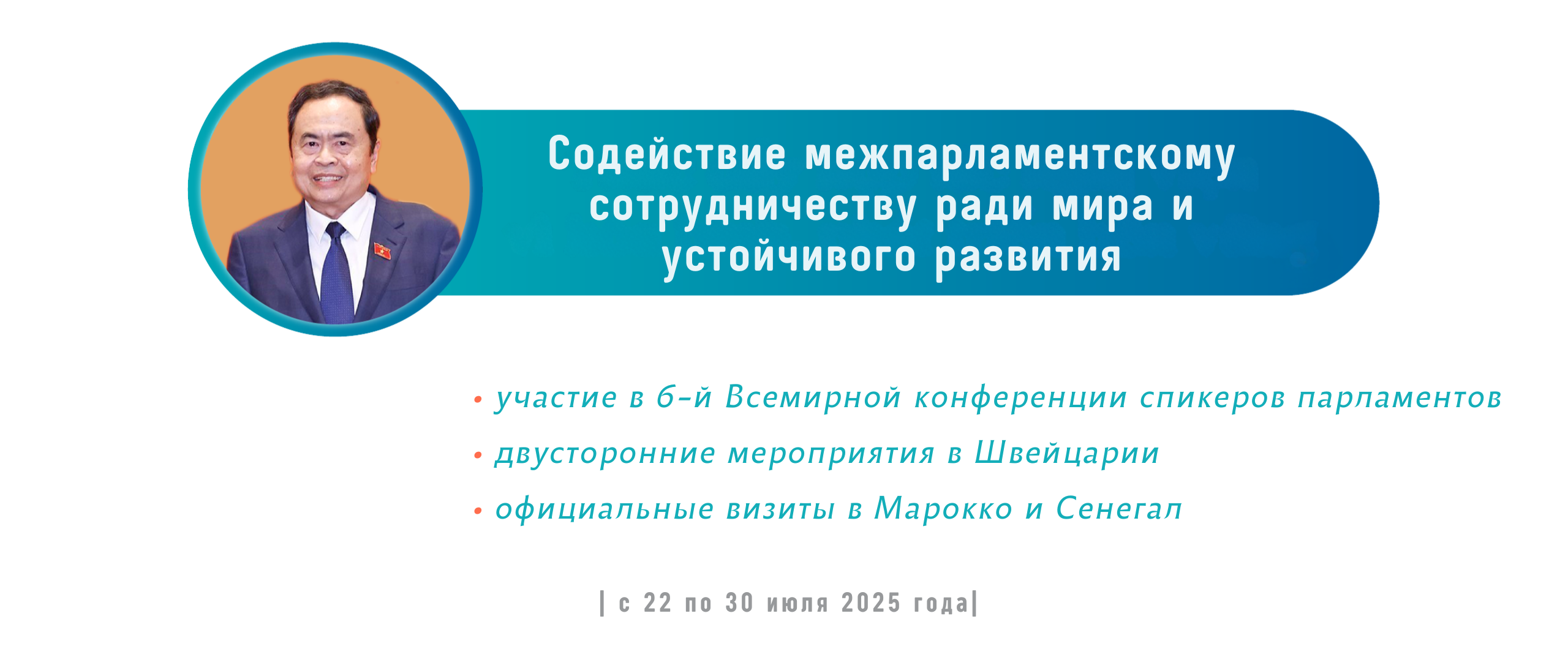 По приглашению Председателя Межпарламентского союза (МПС) Тулии Аксон и Генерального секретаря МПС Мартина Чунгонга, Председателя Палаты представителей Королевства Марокко Рашида Талби Алами и Председателя Национального собрания Республики Сенегал Эль Малика Ндьяйе, Председатель Национального собрания (НС) Вьетнама Чан Тхань Ман от имени руководства вьетнамской Партии и Государства с супругой и высокопоставленная делегация Вьетнама примут участие в 6-й Всемирной конференции спикеров парламентов в Швейцарии, проведут ряд двусторонних мероприятий в этой стране, а также посетят с официальным визитом Марокко и Сенегал с 22 по 30 июля 2025 года.