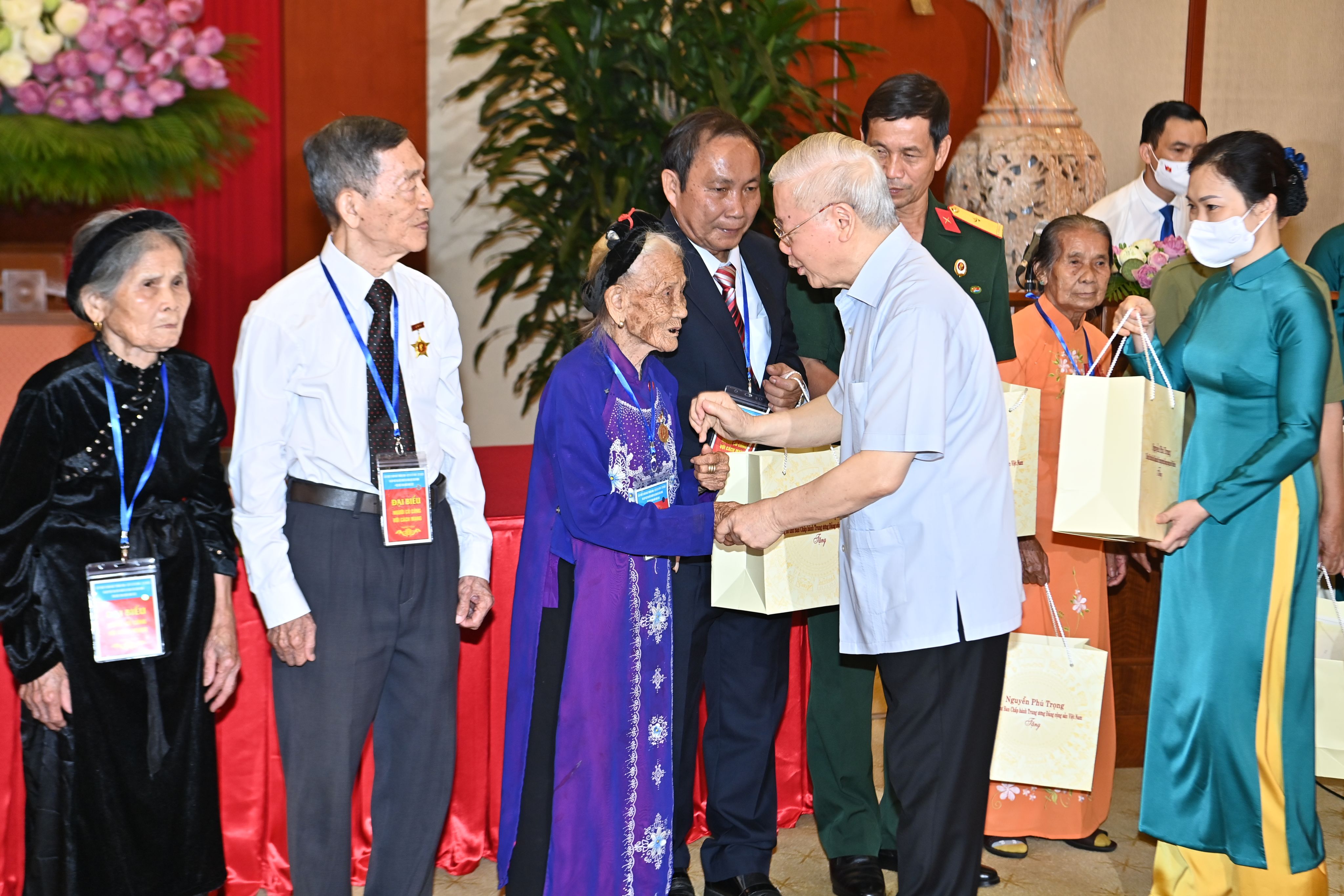 Tổng Bí thư Nguyễn Phú Trọng trao quà tặng các Bà mẹ Việt Nam Anh hùng và các đại biểu tại buổi gặp mặt Đoàn đại biểu người có công với cách mạng tiêu biểu toàn quốc năm 2022. Ảnh: ĐĂNG KHOA