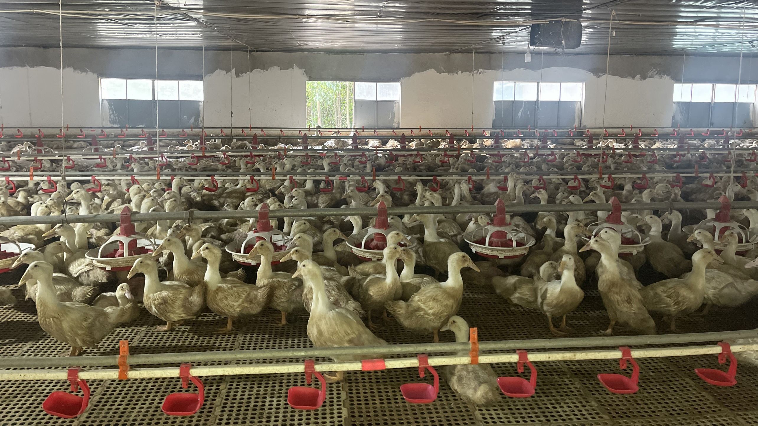 Khu trại nuôi vịt rộng gần 1.000m2 thiết kế kiên cố với tường cao, lắp đặt hệ thống quạt và dàn làm mát, sàn, thiết bị máng thức ăn, nước tự động theo đúng tiêu chuẩn hoàn toàn khép kín.