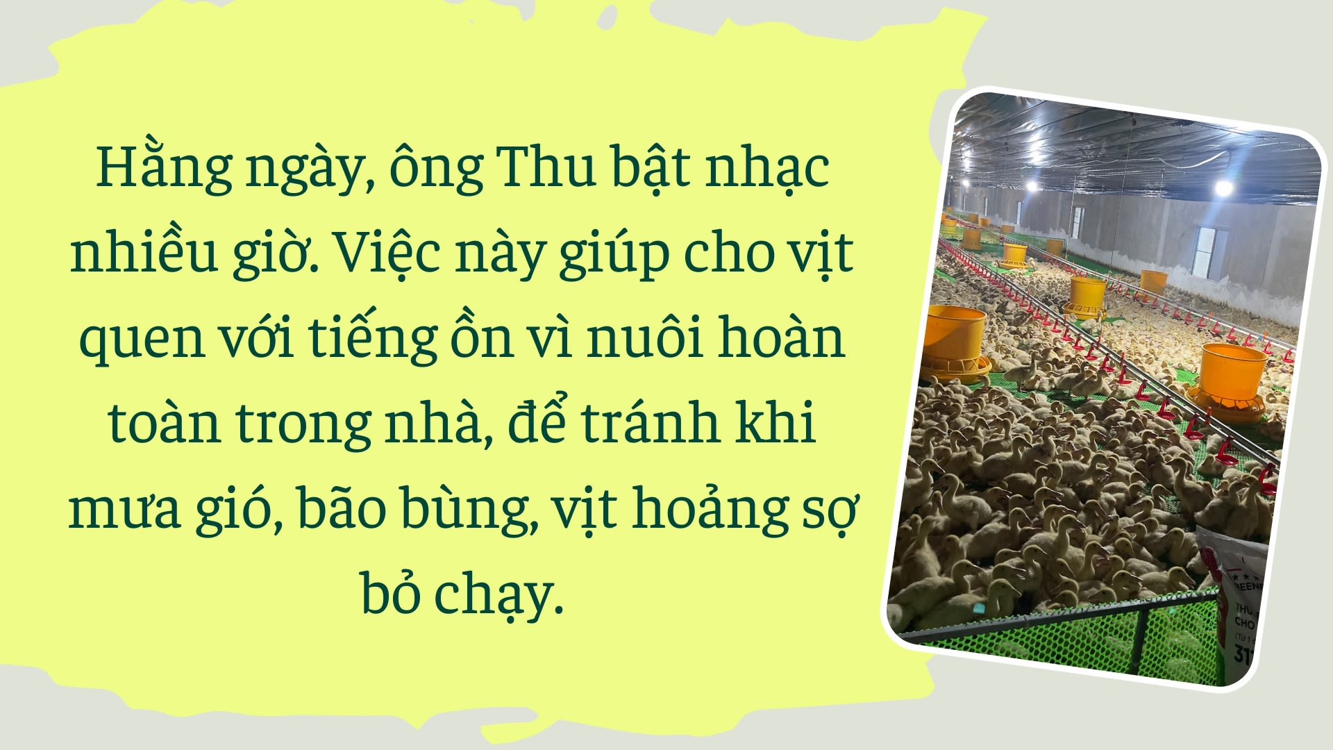 Hằng ngày, ông Thu bật nhạc nhiều giờ, “phát bất kỳ bài hát gì, miễn là có tiếng động để vịt làm quen”, ông Thu bảo. Việc này giúp cho vịt quen với tiếng ồn vì nuôi hoàn toàn trong nhà, để tránh khi mưa gió, bão bùng, vịt hoảng sợ bỏ chạy.