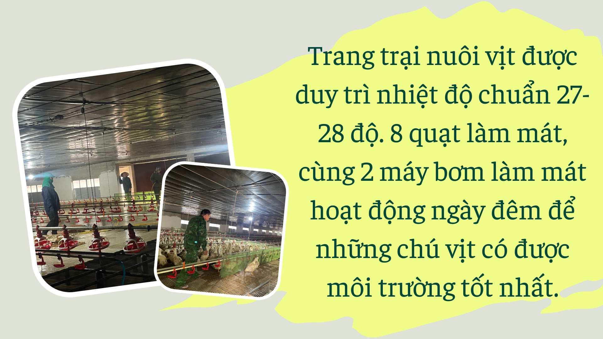 Khác với thời tiết khắc nghiệt, nắng nóng của gió lào Quảng Trị những ngày tháng 7, trang trại nuôi vịt rất mát mẻ, được duy trì nhiệt độ chuẩn 27-28 độ. 8 quạt làm mát, cùng 2 máy bơm làm mát hoạt động ngày đêm để những chú vịt có được môi trường tốt nhất.
