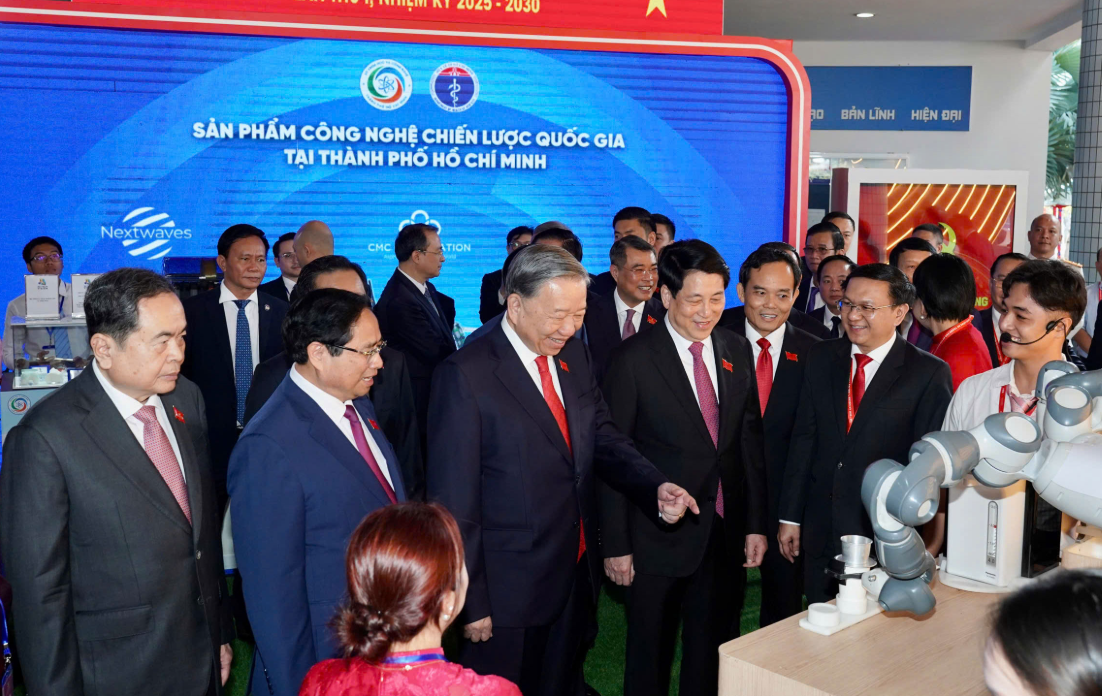 Lãnh đạo Đảng, Nhà nước tham quan không gian triển lãm khoa học công nghệ.