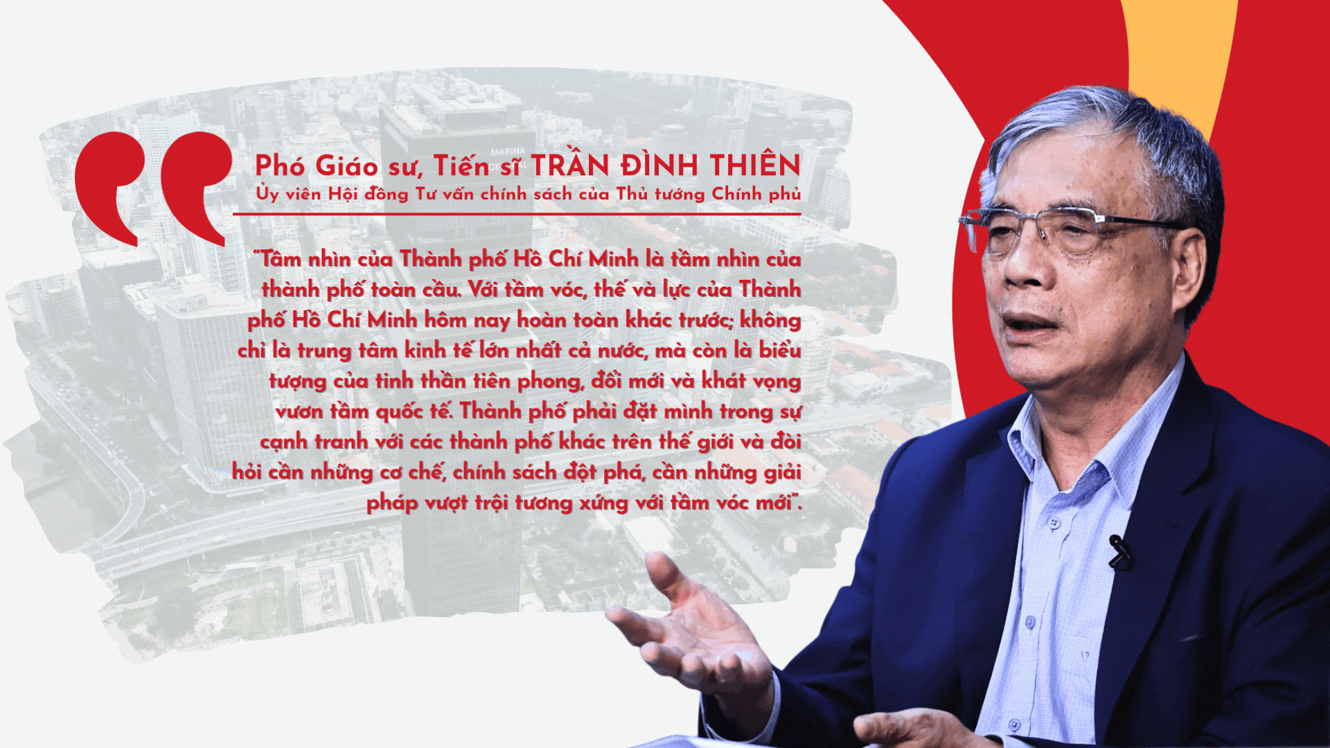 Để Thành phố Hồ Chí Minh phát triển như kỳ vọng, trước hết cần có một tầm nhìn mới. Tầm nhìn mới ở đây, trước hết là tư duy mới về không gian phát triển vùng. Đó là sự kết nối giữa công nghiệp công nghệ cao của Bình Dương; cảng biển và năng lượng của Bà Rịa-Vũng Tàu; với tài chính, thương mại, đổi mới sáng tạo của Thành phố Hồ Chí Minh. Cách tiếp cận mới về quản trị đô thị hiện đại, từ phân cấp, phân quyền mạnh mẽ hơn cho đến ứng dụng công nghệ, dữ liệu lớn, trí tuệ nhân tạo trong điều hành; xây dựng chính quyền đô thị thông minh, năng động, minh bạch, vì người dân và doanh nghiệp.