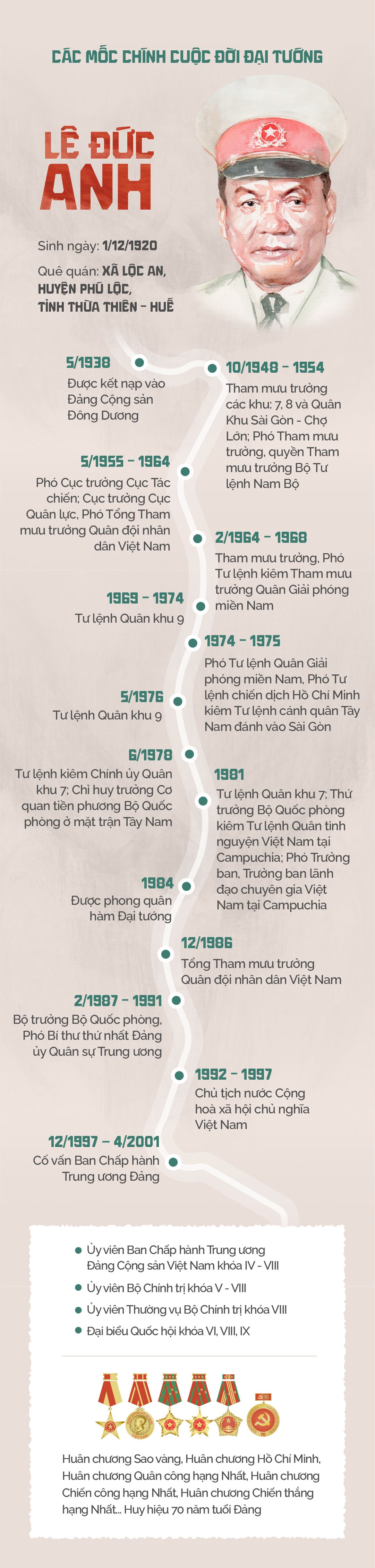Hơn 80 năm tham gia hoạt động cách mạng, 30 năm chỉ huy chiến đấu trên chiến trường Nam Bộ, gần 10 năm làm nhiệm vụ quốc tế trên đất bạn Campuchia, đồng chí Lê Đức Anh là một người cộng sản kiên cường, nhà lãnh đạo xuất sắc, có uy tín lớn của Đảng, Nhà nước và nhân dân. Là một vị tướng dày dạn trận mạc, có tầm nhìn chiến lược, xử lý linh hoạt trong mọi tình huống, đồng chí luôn có mặt trên các chiến trường ác liệt nhất, trong những thời điểm gay go nhất với nhiều trận đánh mang tính lịch sử, tạo ra những bước ngoặt lớn trong sự nghiệp đấu tranh giải phóng dân tộc.
