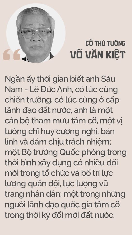 Ngần ấy thời gian biết anh Sáu Nam - Lê Đức Anh, có lúc cùng chiến trường, có lúc cùng ở cấp lãnh đạo đất nước, anh là một cán bộ tham mưu tầm cỡ, một vị tướng chỉ huy cương nghị, bản lĩnh và dám chịu trách nhiệm; một Bộ trưởng Quốc phòng trong thời bình xây dựng có nhiều đổi mới trong tổ chức và bố trí lực lượng quân đội, lực lượng vũ trang nhân dân; một trong những người lãnh đạo quốc gia tầm cỡ trong thời kỳ đổi mới đất nước.