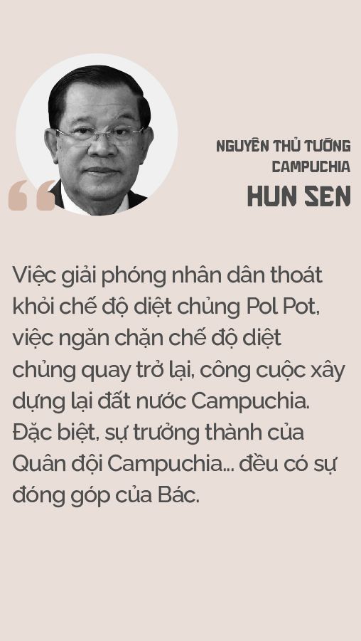 Việc giải phóng nhân dân thoát khỏi chế độ diệt chủng Pol Pot, việc ngăn chặn chế độ diệt chủng quay trở lại, công cuộc xây dựng lại đất nước Campuchia. Đặc biệt, sự trưởng thành của Quân đội Campuchia... đều có sự đóng góp của Bác.
