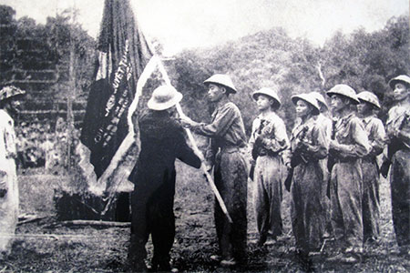 Đại tướng Võ Nguyên Giáp trao lá cờ "Quyết chiến quyết thắng" cho Đại đoàn 312 do đồng chí Lê Trọng Tấn làm Đại đoàn trưởng.