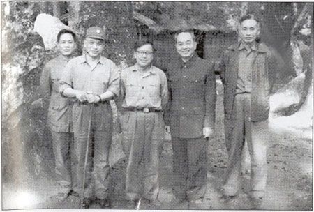 Đại tướng Võ Nguyên Giáp với Tư lệnh Chiến dịch Đường 9-Nam Lào Lê Trọng Tấn (ngoài cùng, bên phải) sau chiến thắng tháng 2/1971.