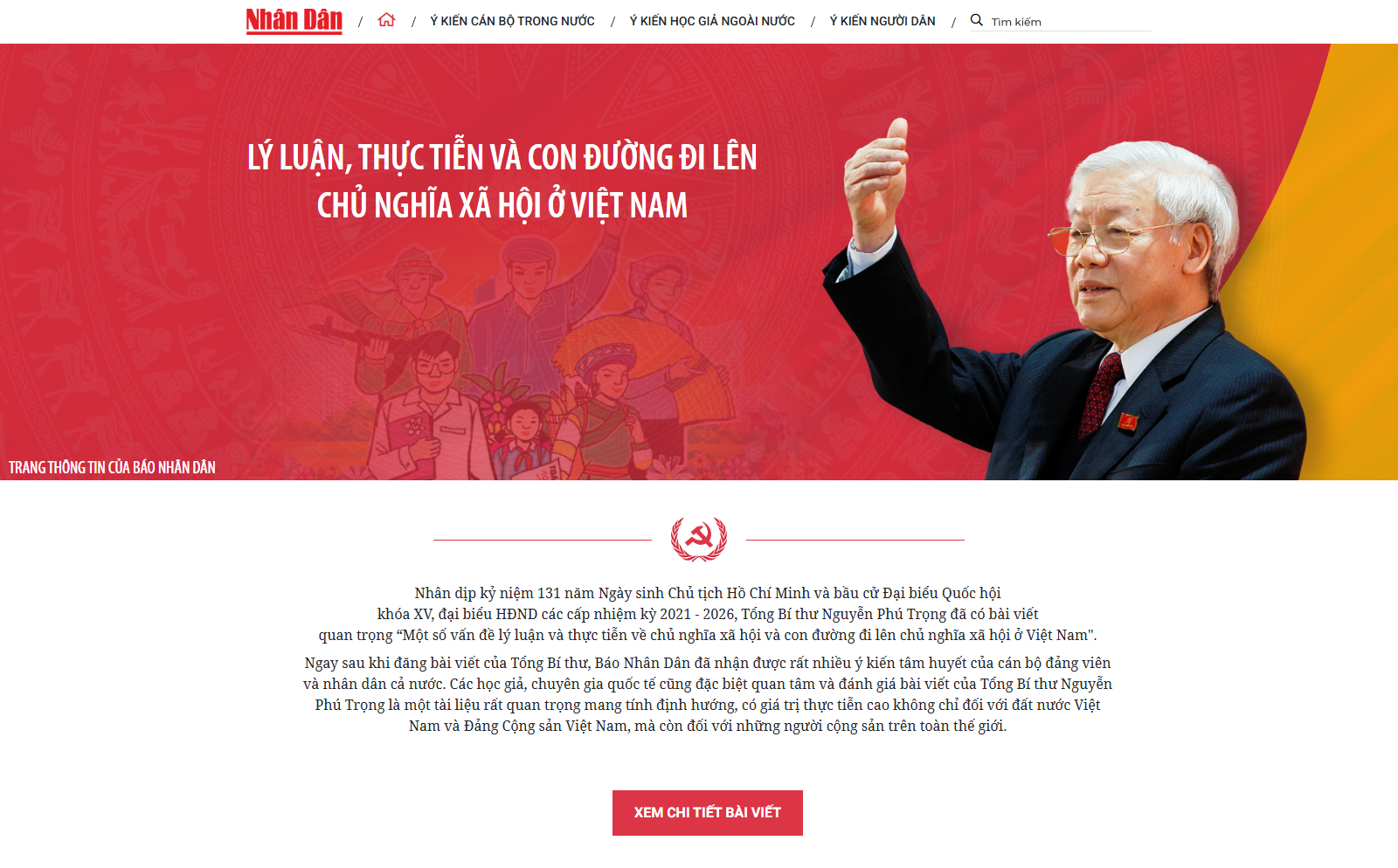 Ngày 26/10/2021, lần đầu tiên Báo Nhân Dân ra mắt một chuyên trang thông tin đặc biệt được thực hiện công phu với sự kết hợp nhiều loại hình báo chí, nhằm phát triển lý luận về xây dựng Đảng. Trang Thông tin đặc biệt “Lý luận, thực tiễn và con đường đi lên chủ nghĩa xã hội ở Việt Nam” tại địa chỉ http://cnxh.nhandan.vn giúp lan tỏa rộng rãi trên môi trường internet những nội dung cốt lõi trong bài viết “Một số vấn đề lý luận và thực tiễn về chủ nghĩa xã hội và con đường đi lên chủ nghĩa xã hội ở Việt Nam” của Tổng Bí thư Nguyễn Phú Trọng và những ý kiến tâm huyết của cán bộ, đảng viên, nhân dân cả nước, các học giả, bạn bè quốc tế. Trang thông tin này đã đoạt giải sản phẩm truyền thông sáng tạo tuyên truyền về Xây dựng Đảng của Giải Búa Liềm vàng năm 2021.