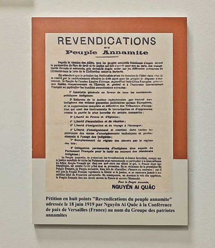 Имя Нгуен Ай Куок появилось в июне 1919 года, когда он от имени вьетнамских патриотов во Франции направил в адрес Версальской конференции «Претензии народа Аннама» – документ из 8 пунктов, в котором французскому Правительству предлагалось признать демократические свободы и право на равенство вьетнамского народа.