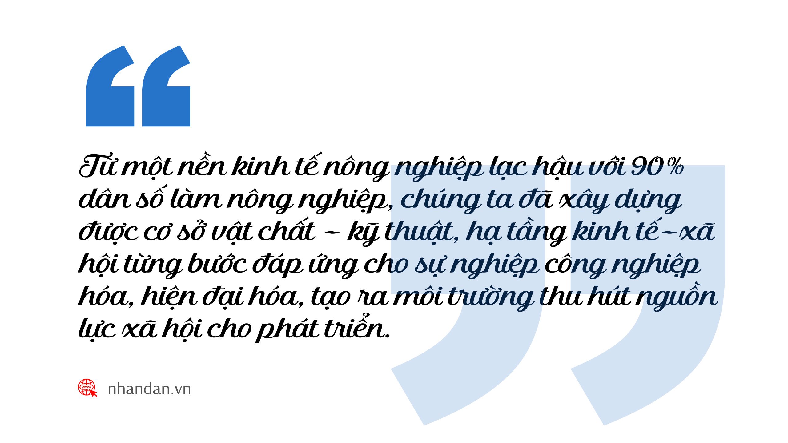 Thực lực của nền kinh tế tăng lên; kinh tế vĩ mô cơ bản ổn định; lạm phát được kiểm soát; tăng trưởng kinh tế được duy trì hợp lý và được đánh giá là thuộc nhóm nước có mức tăng trưởng khá cao trên thế giới. Từ một nền kinh tế nông nghiệp lạc hậu với 90% dân số làm nông nghiệp, chúng ta đã xây dựng được cơ sở vật chất - kỹ thuật, hạ tầng kinh tế-xã hội từng bước đáp ứng cho sự nghiệp công nghiệp hóa, hiện đại hóa, tạo ra môi trường thu hút nguồn lực xã hội cho phát triển.