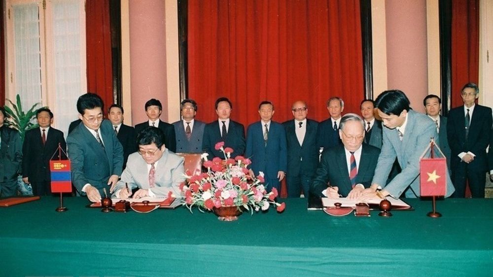 1994年,越南国家主席黎德英和蒙古国总统彭萨勒玛·奥其尔巴特(Punsalmaagiin Ochirbat)签署《联合声明》。(图片来源:越通社)