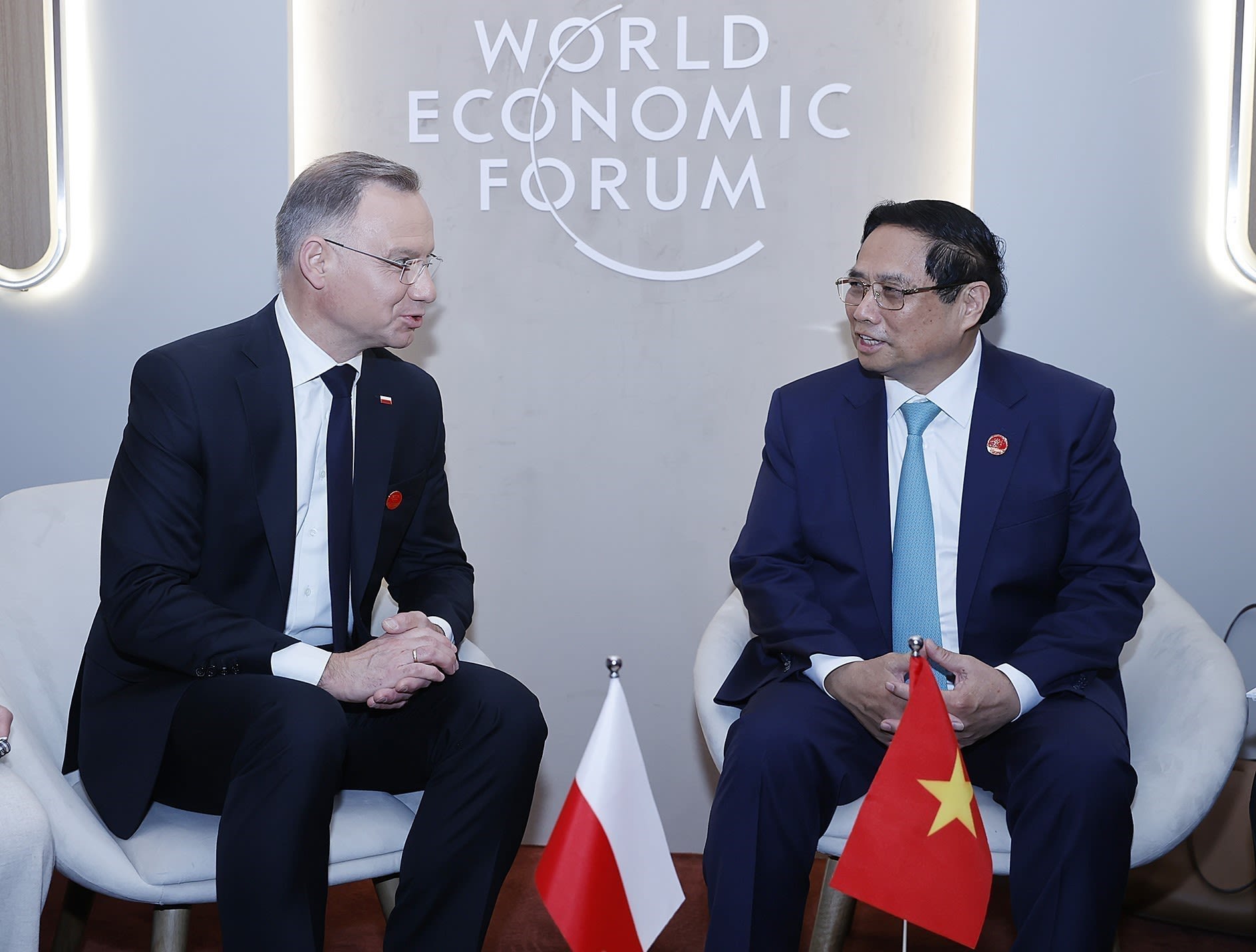 В рамках участия в 15-м ежегодном совещании новых мировых лидеров ВЭФ в Китае 25 июня 2024 г. Премьер-министр Фам Минь Тьинь встретился с Президентом Польши Анджеем Дудой. Фото: ВИА