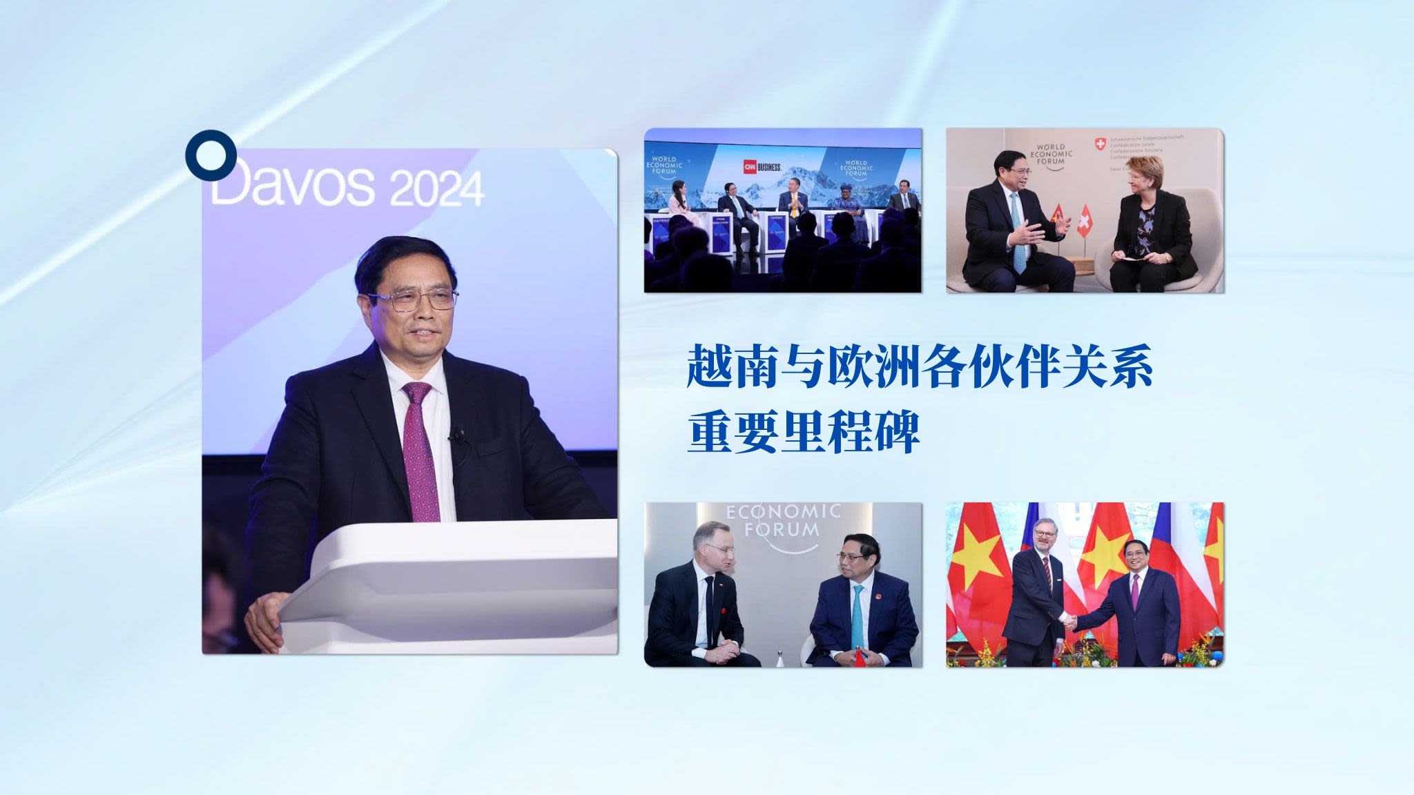 越南政府总理范明正携夫人及高级代表团对波兰、捷克进行正式访问,出席在瑞士达沃斯举行的世界经济论坛第55届年会并展开双边活动,为越南与波兰、捷克、瑞士等国传统友谊与多领域合作关系开启新篇章,增进政治互信,继续推动与欧洲国家合作走向深入且实质性高效发展。