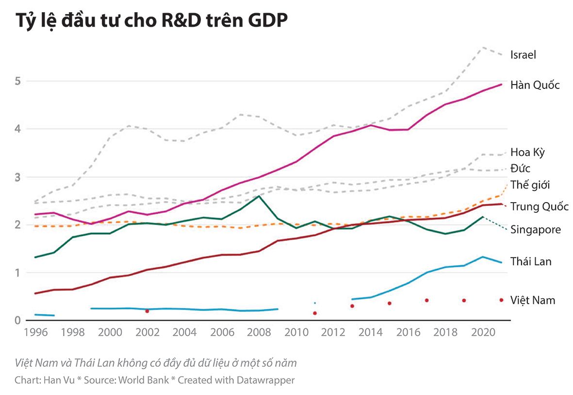 Đặt nhiều tâm huyết vào R&D, cho rằng đó là vấn đề cốt yếu, sống còn của một đất nước muốn phát triển, muốn thoát khỏi bẫy thu nhập trung bình, ông Cường nhận định, trước hết Việt Nam phải nhìn nhận rõ mình đang ở đâu, muốn đi đến đâu? Điểm xuất phát và đích đến sẽ giúp nhìn rõ hơn con đường, và xác định tới đích như thế nào. “Tìm hiểu số liệu từ Ngân hàng thế giới (WB), chúng tôi nhận thấy rằng tỷ lệ đầu tư cho R&D của Việt Nam năm 2021 đạt khoảng 0,42% GDP. Đây là tỷ lệ rất thấp so với các quốc gia hàng đầu thế giới về khoa học công nghệ, thấp so với trung bình thế giới và thấp ngay cả khi so với các quốc gia khác trong khu vực như Thái Lan, Malaysia, đặc biệt là Singapore. Việt Nam đứng ở nửa cuối, khoảng thứ 56/86 quốc gia/vùng lãnh thổ mà WB có dữ liệu”, ông Cường nhấn mạnh. Cũng theo số liệu của WB, quốc gia đứng đầu thế giới về đầu tư cho R&D trên tổng GDP là Israel với xấp xỉ 5,8% GDP. Thứ hai là Hàn Quốc dành khoảng 4,9% GDP cho R&D, Hoa Kỳ xếp thứ 3 với xấp xỉ 3,5%. Nếu so sánh về con số tuyệt đối, mức độ đầu tư cho R&D của Việt Nam còn thấp hơn nhiều, do quy mô GDP còn rất khiêm tốn so với các nước Hoa Kỳ, Trung Quốc, Hàn Quốc, Đức… Việc nâng kinh phí chi cho R&D của Việt Nam đạt mức 2% GDP vào năm 2030 là bước nhảy vọt đáng kể, nhất là phần lớn trong mục tiêu đó sẽ đến từ khối tư nhân. WB cũng công bố, từ năm 1990 đến nay, chỉ có 34 nền kinh tế thoát được “bẫy thu nhập trung bình”. Hiện có 108 quốc gia khác nỗ lực vượt qua “bẫy” này, trong đó có Việt Nam. Hơn 1/3 trong số 34 quốc gia thoát “bẫy thu nhập trung bình” là nhờ việc gia nhập EU hoặc phát hiện dầu mỏ.