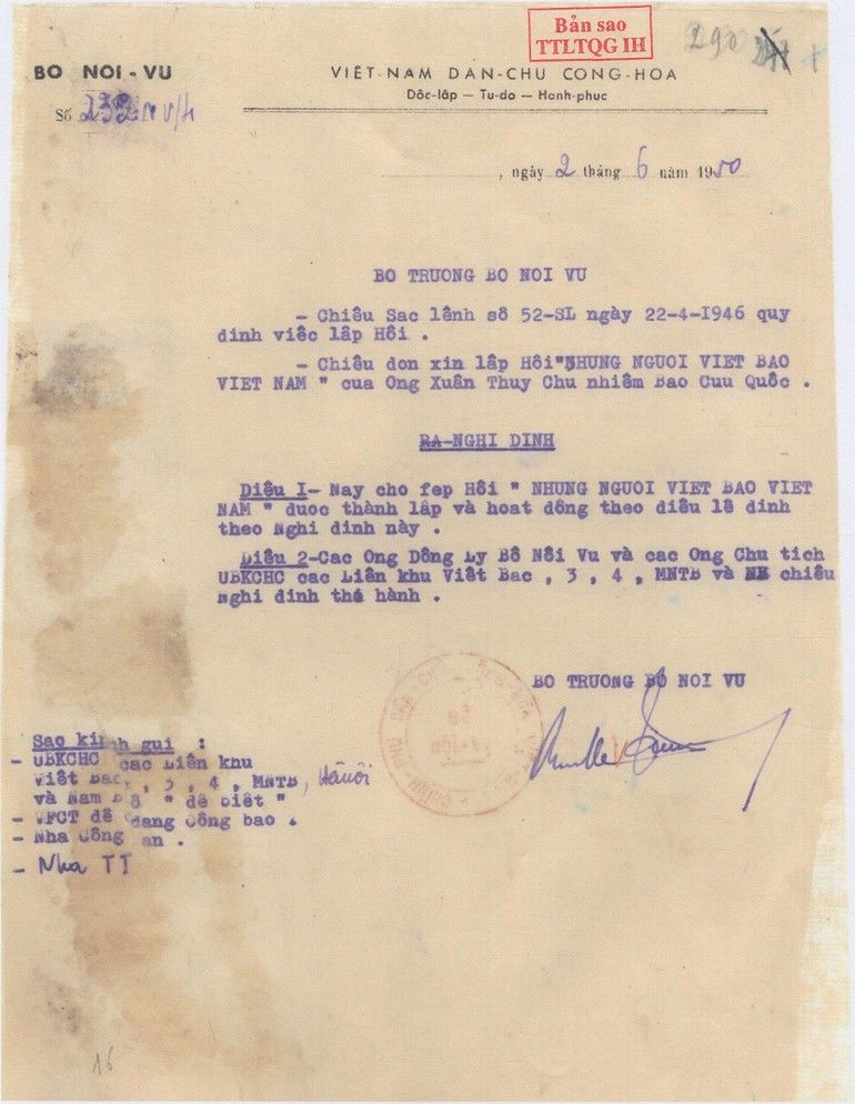 Le décret n° 232/NV du 2 juin 1950 autorise la création et le fonctionnement de l’Association des Journalistes vietnamiens. Source : Musée de la presse du Vietnam.