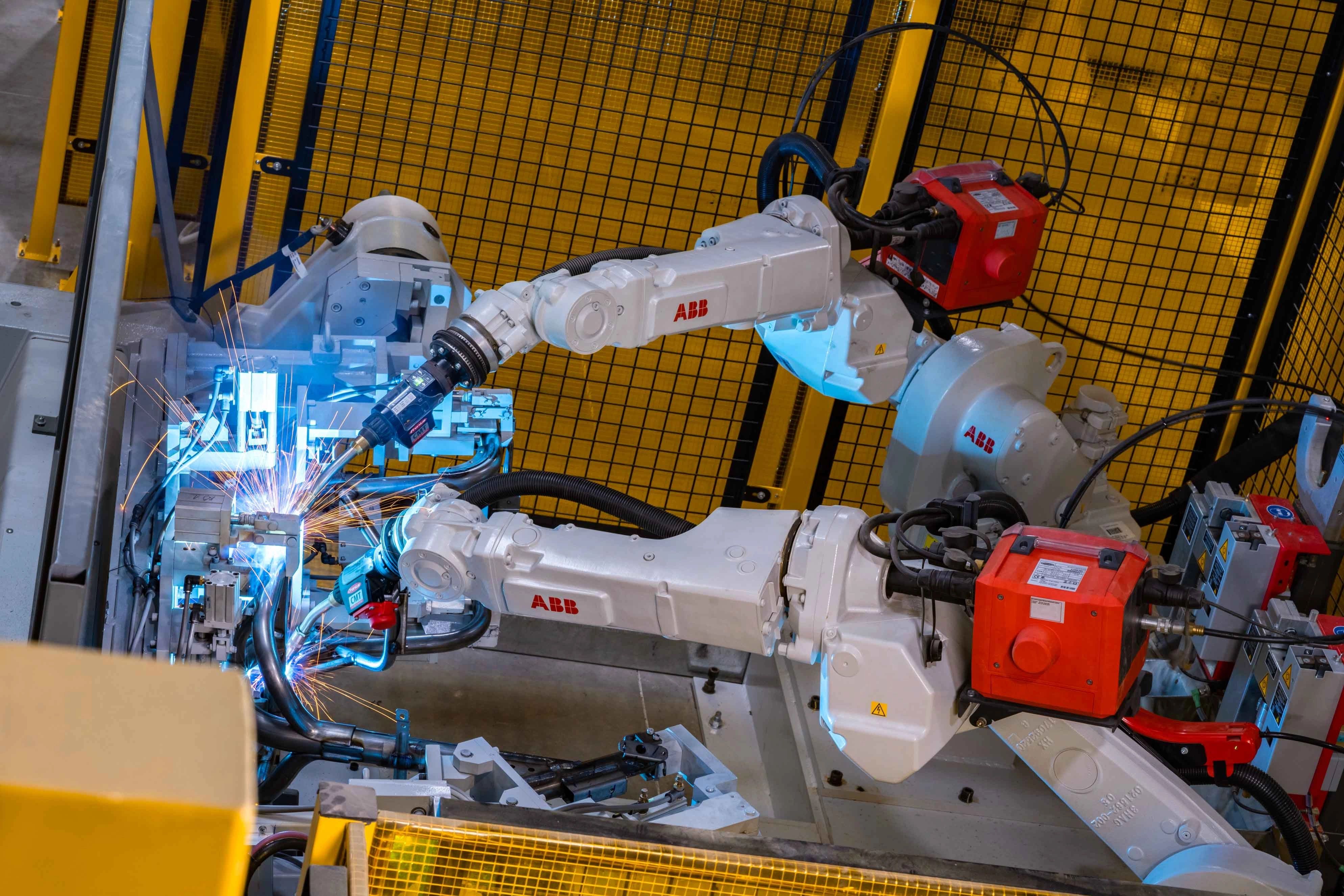 Un robot effectuant le soudage du châssis d'un véhicule.