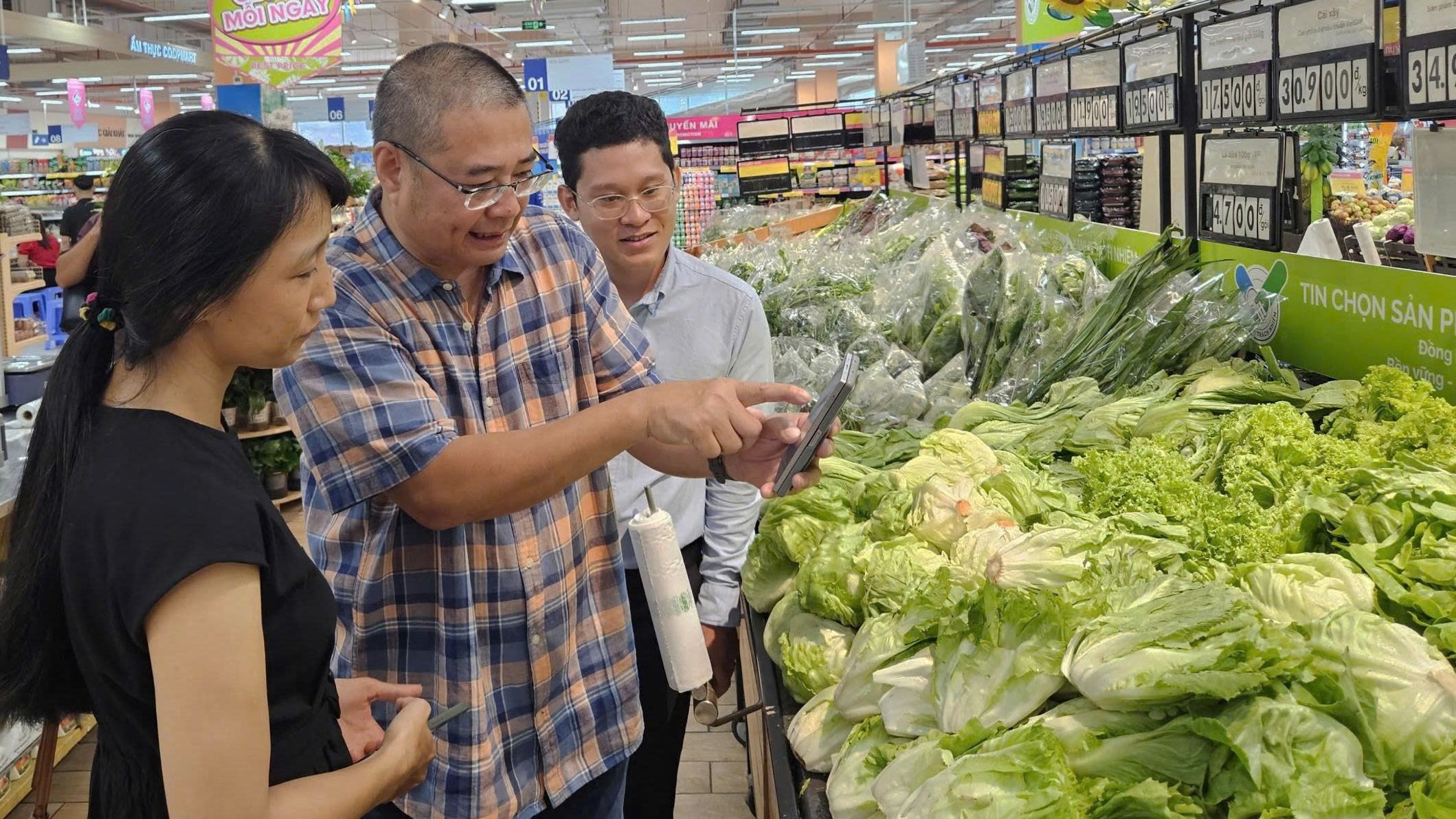 Ông Đào Hà Trung (giữa) hướng dẫn cách quét mã QR kiểm tra thông tin trên sản phẩm được dán “Tick xanh trách nhiệm” tại một siêu thị.