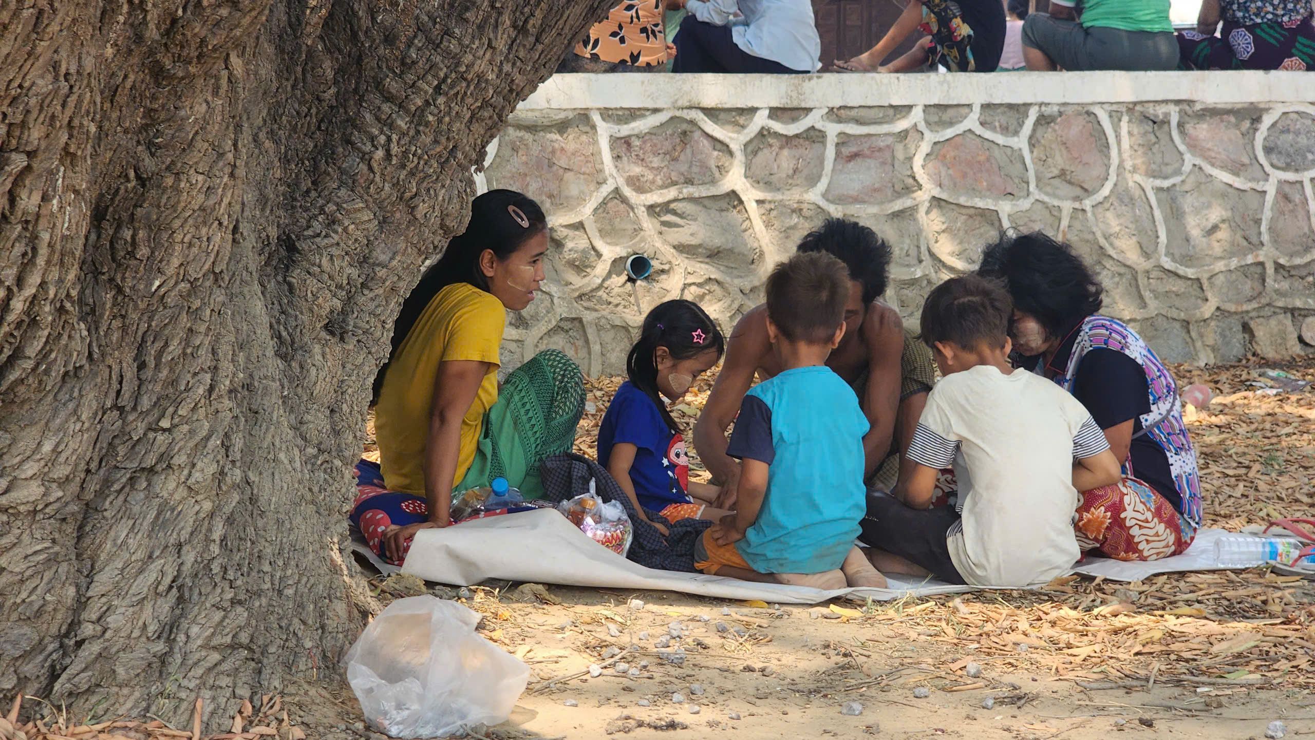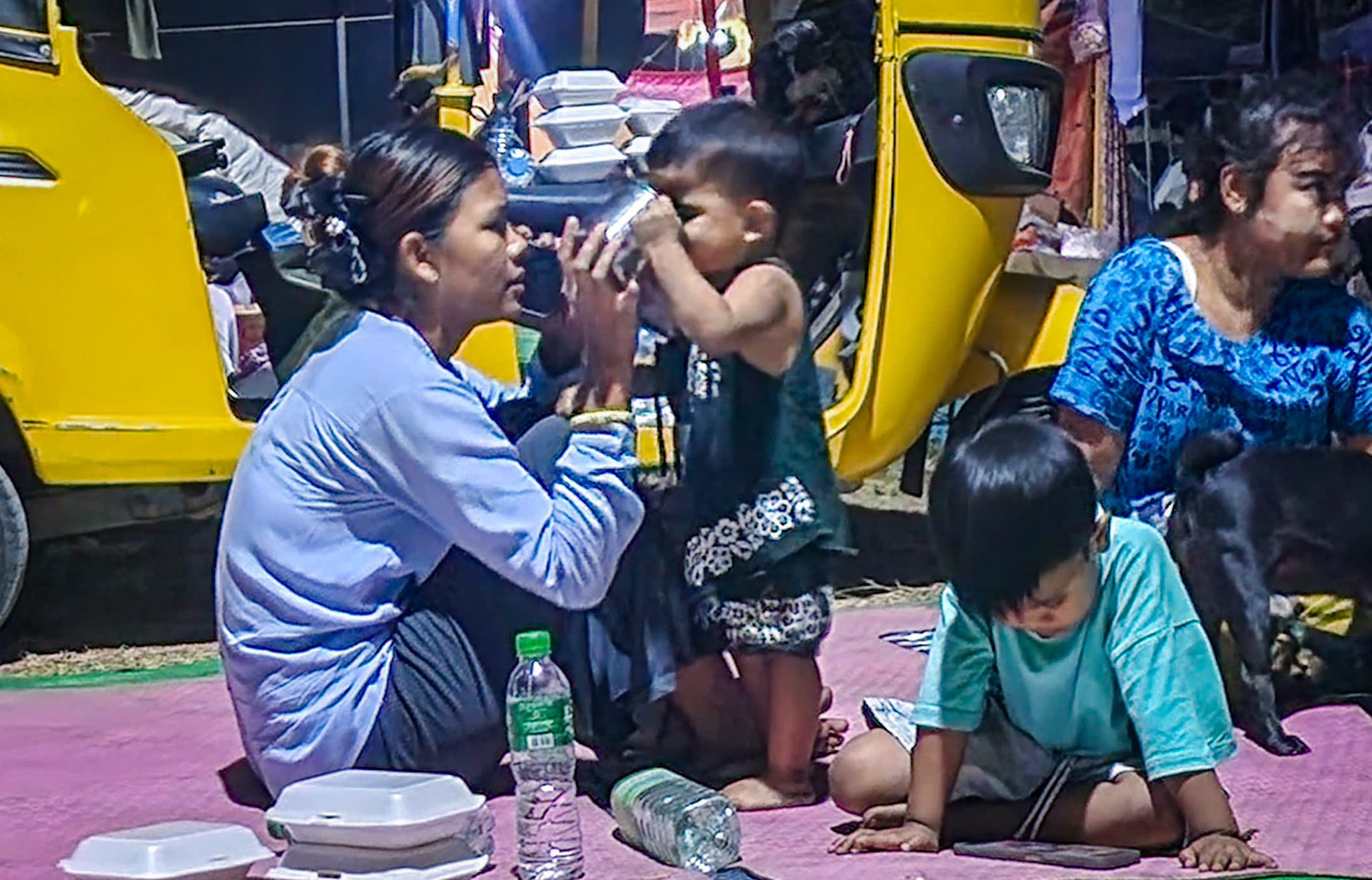 Chỉ tay vào 3 đứa trẻ đang bốc thức ăn đựng trong hộp xốp, Khaing mỉm cười: “Không ai trong gia đình tôi bị thương. Nhưng lũ trẻ thì rất sợ hãi. Nhà chúng tôi cũng nứt hết rồi. Vậy nên, tất cả ra đây ở tạm”.