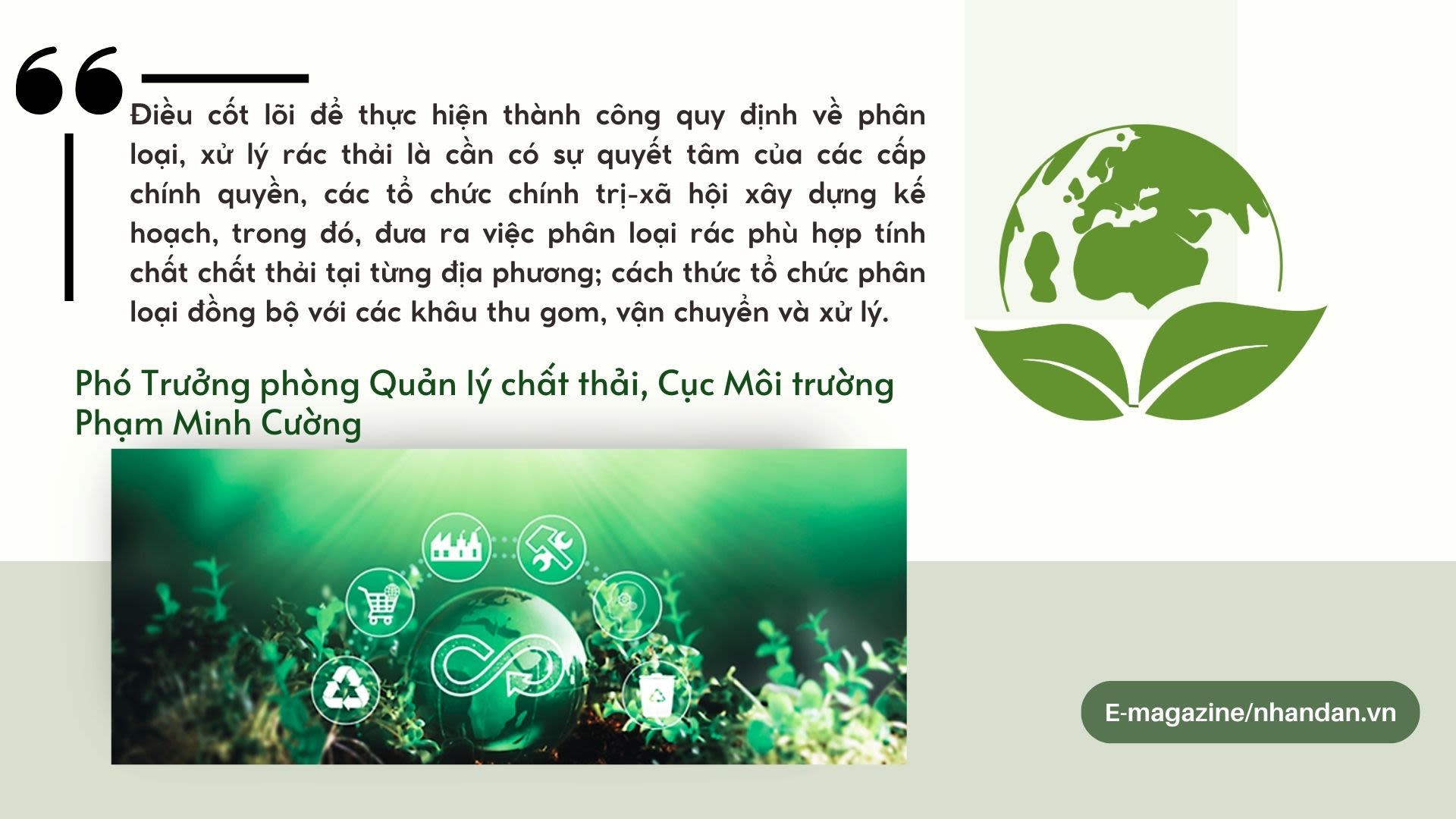 Trong khi đó, bà Lê Thị Tuyết Nhung, Chủ tịch Ủy ban Mặt trận Tổ quốc phường Long Thạnh Mỹ, Thành phố Thủ Đức (Thành phố Hồ Chí Minh) cho biết: Điều quan trọng là phải tập thói quen phân loại rác trong hộ dân, chậm nhưng chắc chắn. Để làm được điều đó, thời gian tới, việc truyền thông, nâng cao nhận thức cộng đồng cần đẩy mạnh áp dụng chuyển đổi số vào công tác tuyên truyền, giáo dục về bảo vệ môi trường và phân loại rác thải.