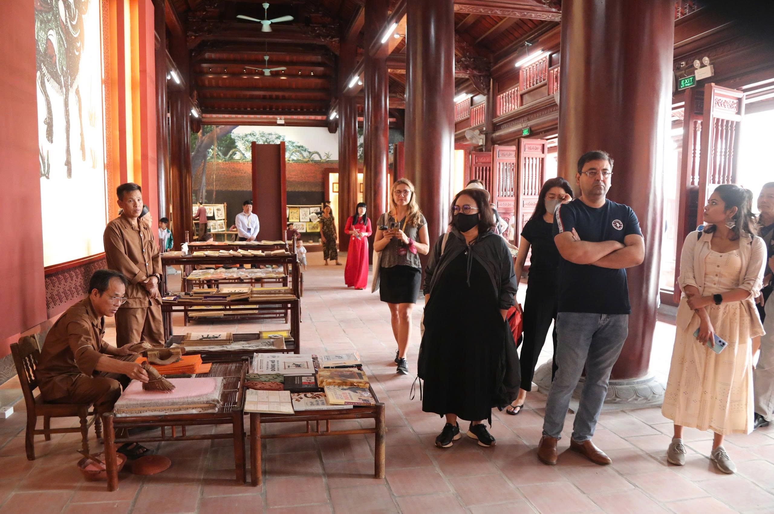 Иностранные туристы знакомятся с созданием народной картины Донгхо.