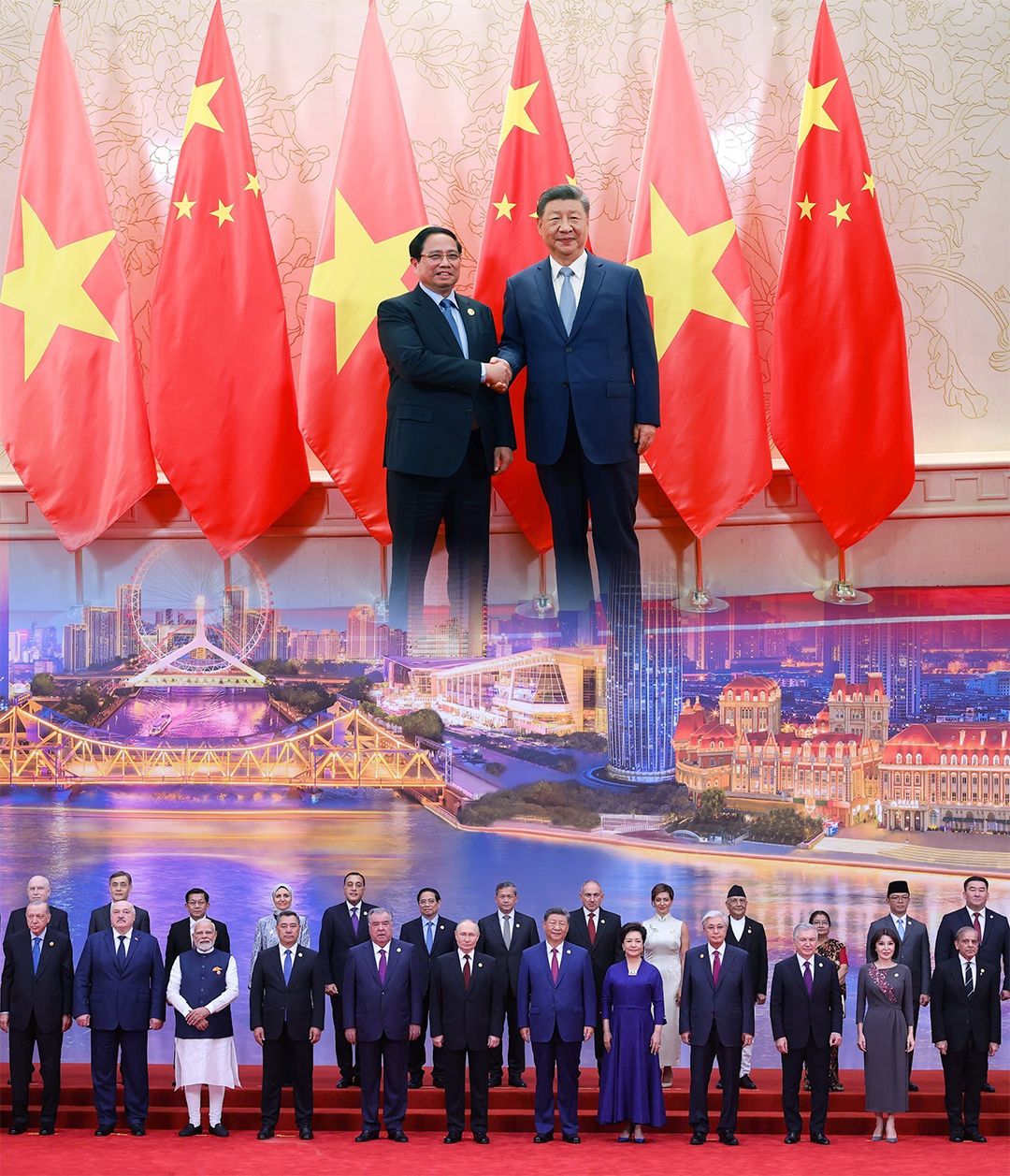 El secretario general del Partido Comunista y presidente de China, Xi Jinping, y el primer ministro de Vietnam, Pham Minh Chinh, junto con los jefes de delegaciones que asisten a la Cumbre de la OCS 2025. (Foto: VNA)