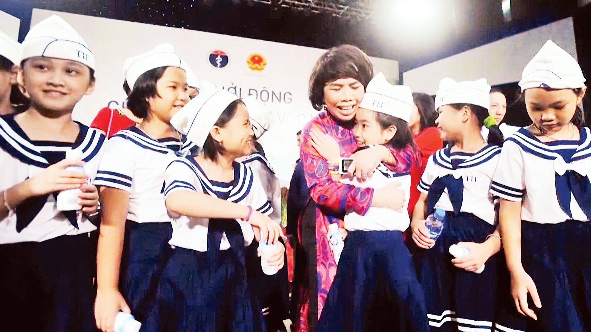 Anh hùng Lao động Thái Hương động viên các em học sinh tại Lễ khởi động chương trình Chung tay vì tầm vóc Việt.
