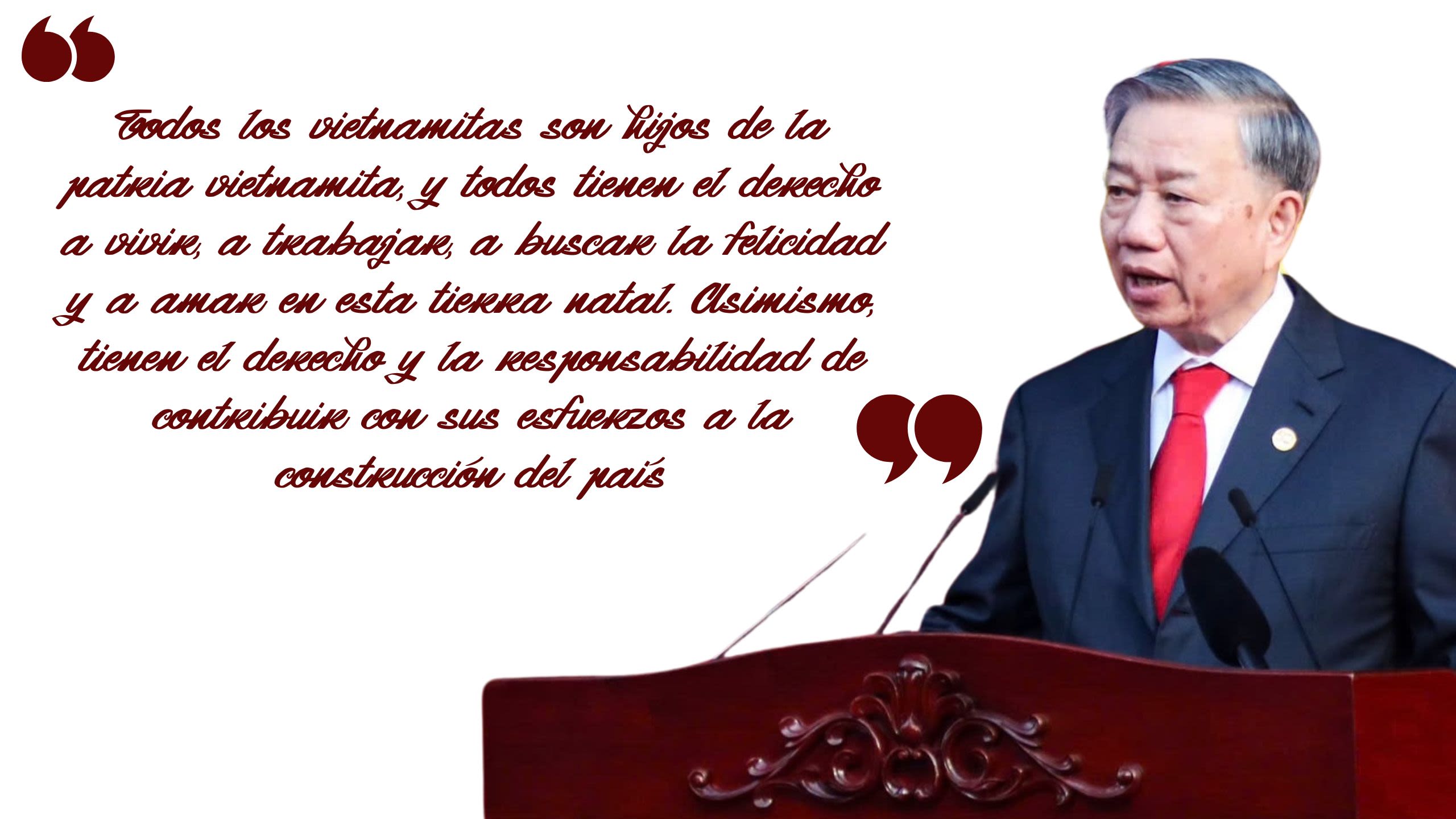 Conscientes de la inmensa e incomparable fuerza del pueblo y de la gran unidad nacional, comprendemos profundamente y aplicamos de manera consistente el punto de vista de que "el pueblo es la raíz", y que las personas son el centro, el sujeto y el objetivo de la causa de construcción y desarrollo del país, y la protección de la Patria. Debemos también implementar de manera decidida la política de reconciliación y armonía nacional con el espíritu de que todos compartimos la misma sangre de Lac Hong, todos somos hermanos "como árboles de la misma raíz, como hijos de la misma familia". Todos los vietnamitas son hijos de la patria vietnamita, y todos tienen el derecho a vivir, a trabajar, a buscar la felicidad y a amar en esta tierra natal. Asimismo, tienen el derecho y la responsabilidad de contribuir con sus esfuerzos a la construcción del país.