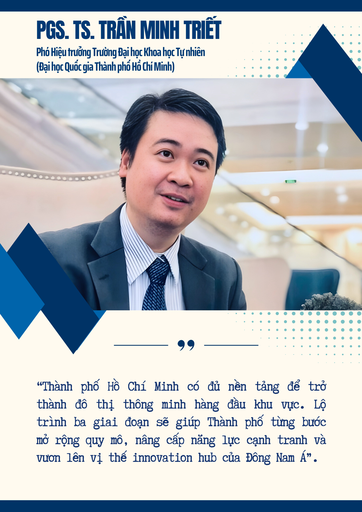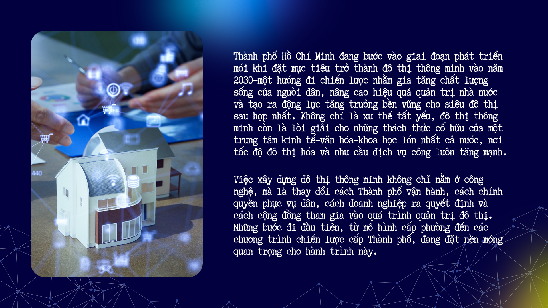 Trong bối cảnh toàn cầu chuyển mình mạnh mẽ sang kinh tế số, Thành phố Hồ Chí Minh có đủ điều kiện để trở thành đô thị thông minh hàng đầu Đông Nam Á vào năm 2030–nơi công nghệ gắn liền với phát triển bền vững, và con người là trung tâm của mọi đổi mới. Đây không chỉ là mục tiêu của chính quyền, mà là kỳ vọng chung của toàn xã hội về một Thành phố năng động, hiện đại, nhân văn, đáng sống và luôn đi đầu trong tiến trình phát triển của Việt Nam.