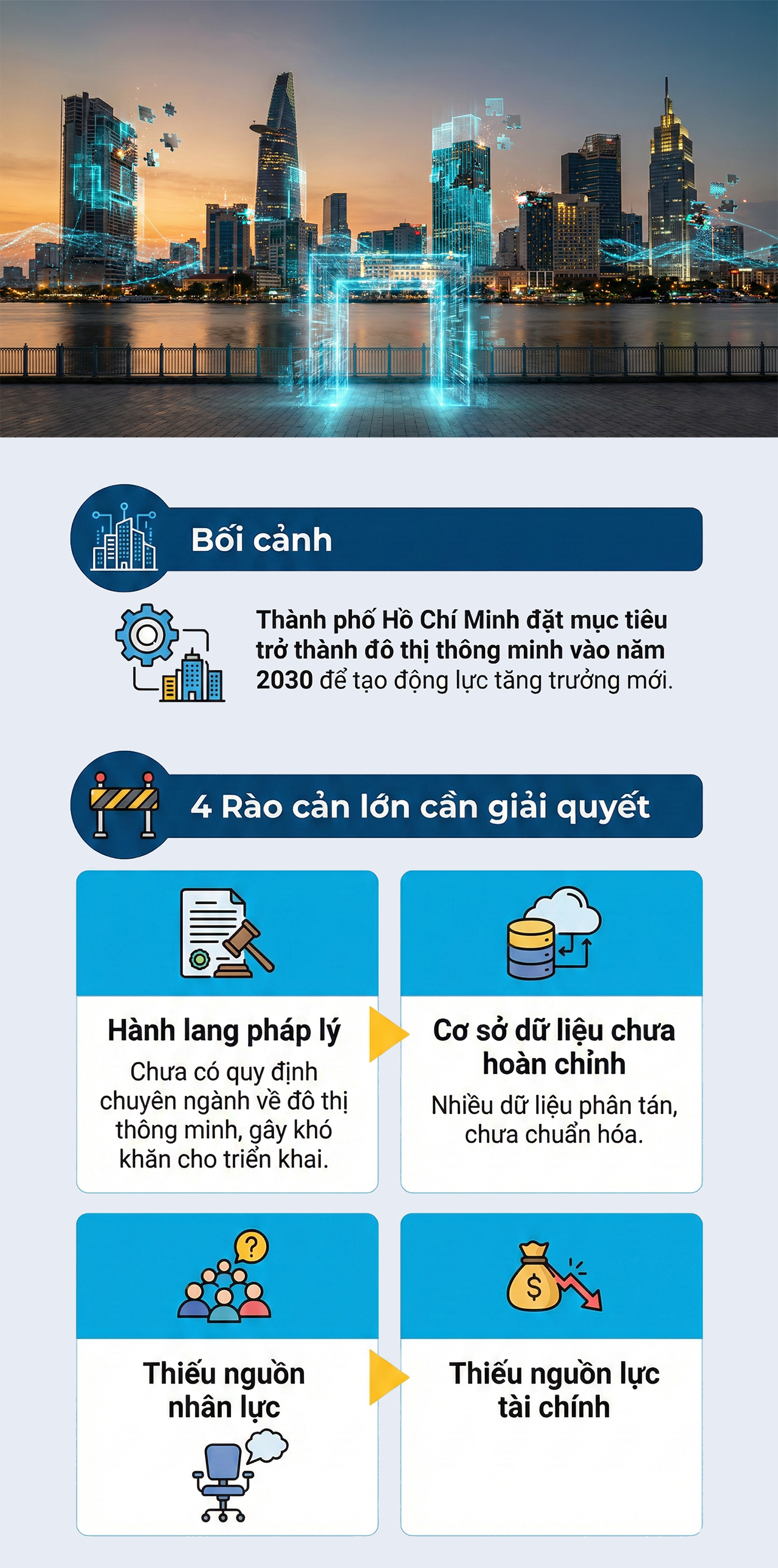 Thành phố Hồ Chí Minh đang đứng trước “ngưỡng cửa” chuyển mình lịch sử khi đặt ra mục tiêu phấn đấu trở thành đô thị thông minh vào năm 2030 nhằm tạo động lực tăng trưởng mới. Tuy nhiên, để trở thành đô thị thông minh vào năm 2030, Thành phố Hồ Chí Minh cần giải quyết đồng bộ các rào cản lớn: