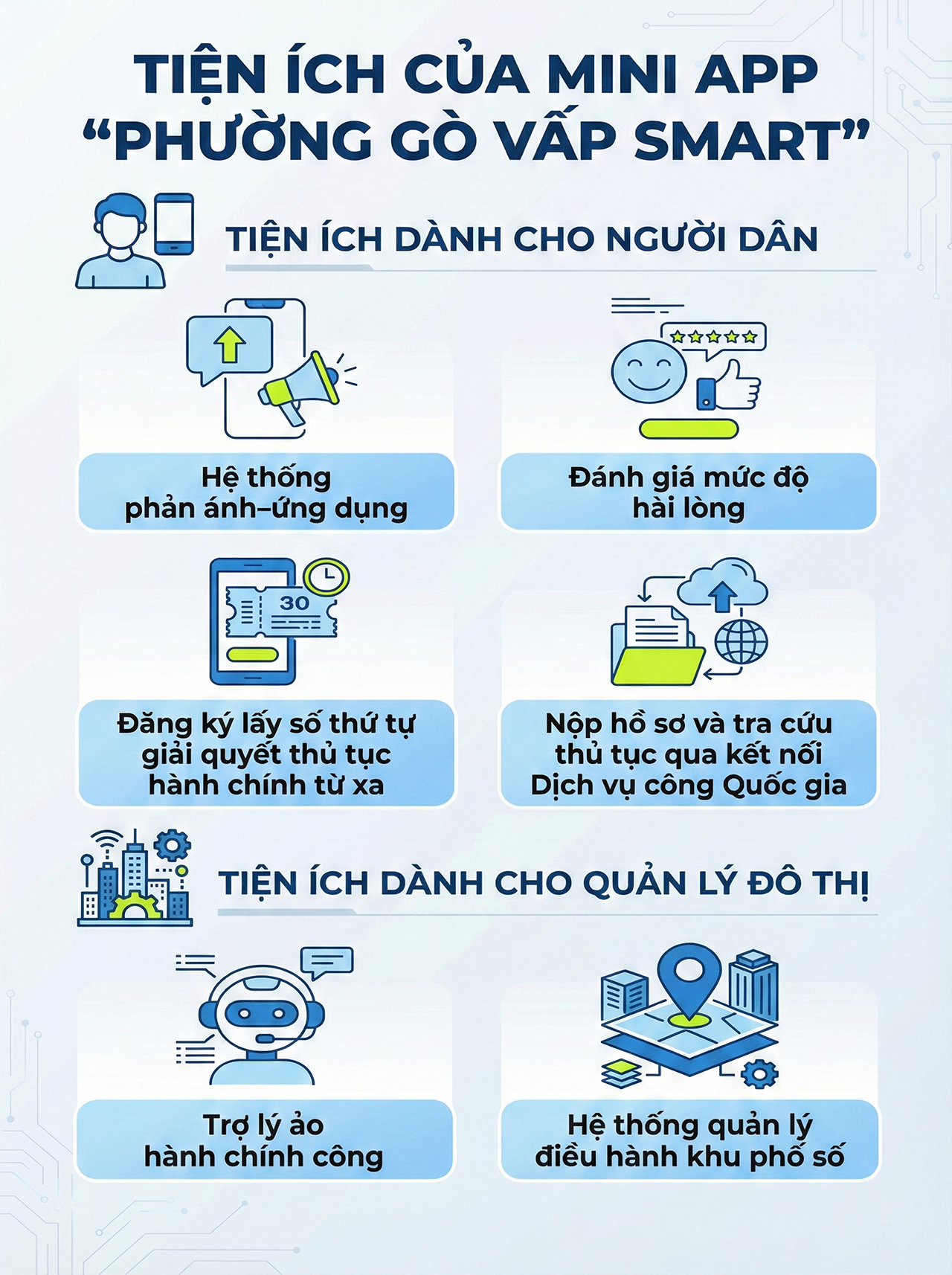 Mini App “Phường Gò Vấp Smart” này không đơn thuần là công cụ số hóa thủ tục, mà còn là kênh giao tiếp chính thống, rộng rãi, thuận tiện giữa chính quyền và người dân trên nền tảng mạng xã hội quen thuộc. Tại đây, người dân, doanh nghiệp được cập nhật thông tin kịp thời, gửi phản ánh dễ dàng, theo dõi tiến độ xử lý, đánh giá chất lượng phục vụ… Đặc biệt, tích hợp trợ lý ảo AI giúp giải đáp thắc mắc 24/7, giảm đáng kể thời gian tìm hiểu thủ tục.