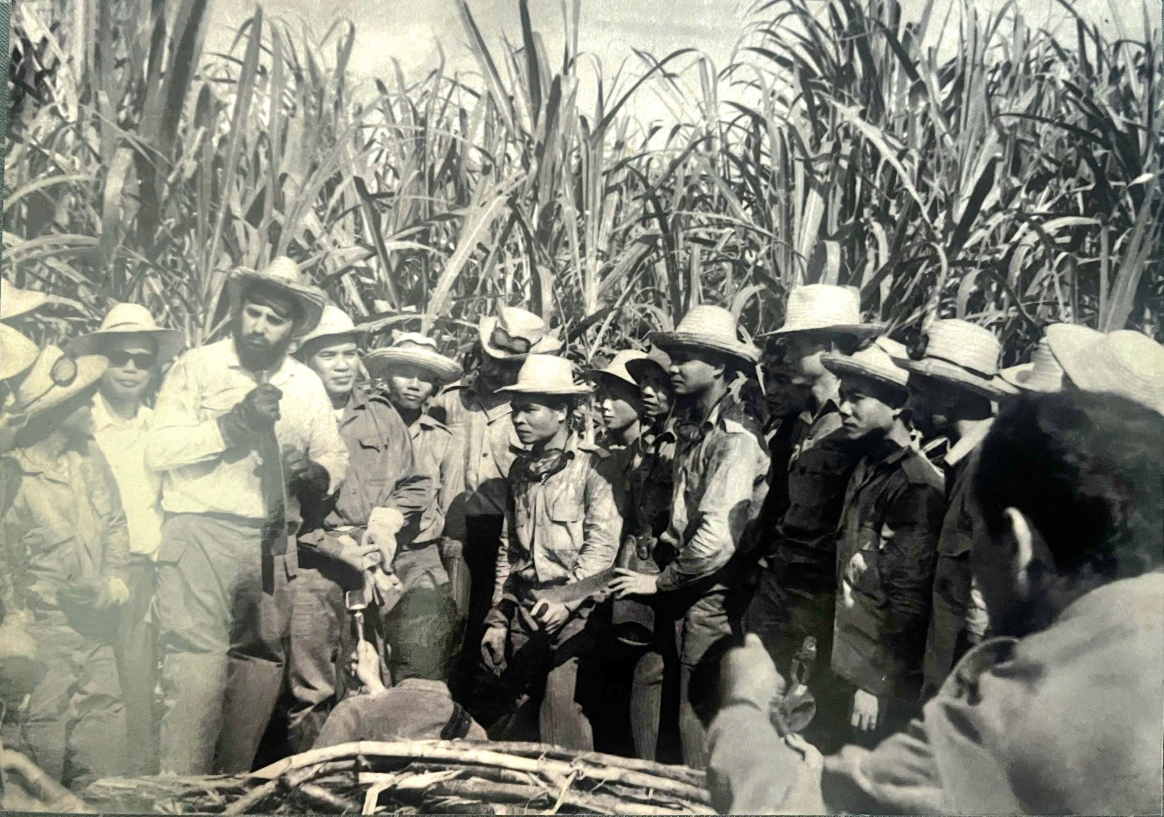 Ông Phạm Xuân Sinh (thứ 6 từ phải sang) vinh dự tham gia buổi chặt mía cùng Fidel Castro và Raúl Castro năm Việt Nam Anh hùng 1967 và các dũng sĩ diệt Mỹ Mặt trận Dân tộc Giải phóng miền Nam Việt Nam. (Ảnh: Nhân vật cung cấp)