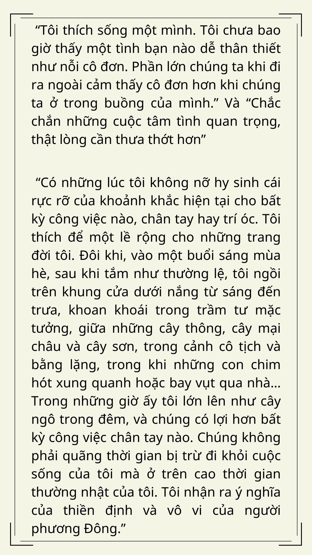 Cuối cùng, người viết bài này chỉ bày tỏ thêm: Walden thực sự là một khu rừng mênh mông và một vài gợi mở như trên chỉ là lời dẫn gọi trân trọng để bạn đọc bước đi trong niềm hân hoan tự khám phá những chiều kích bí ẩn của cuộc sống an nhiên, tự tại.