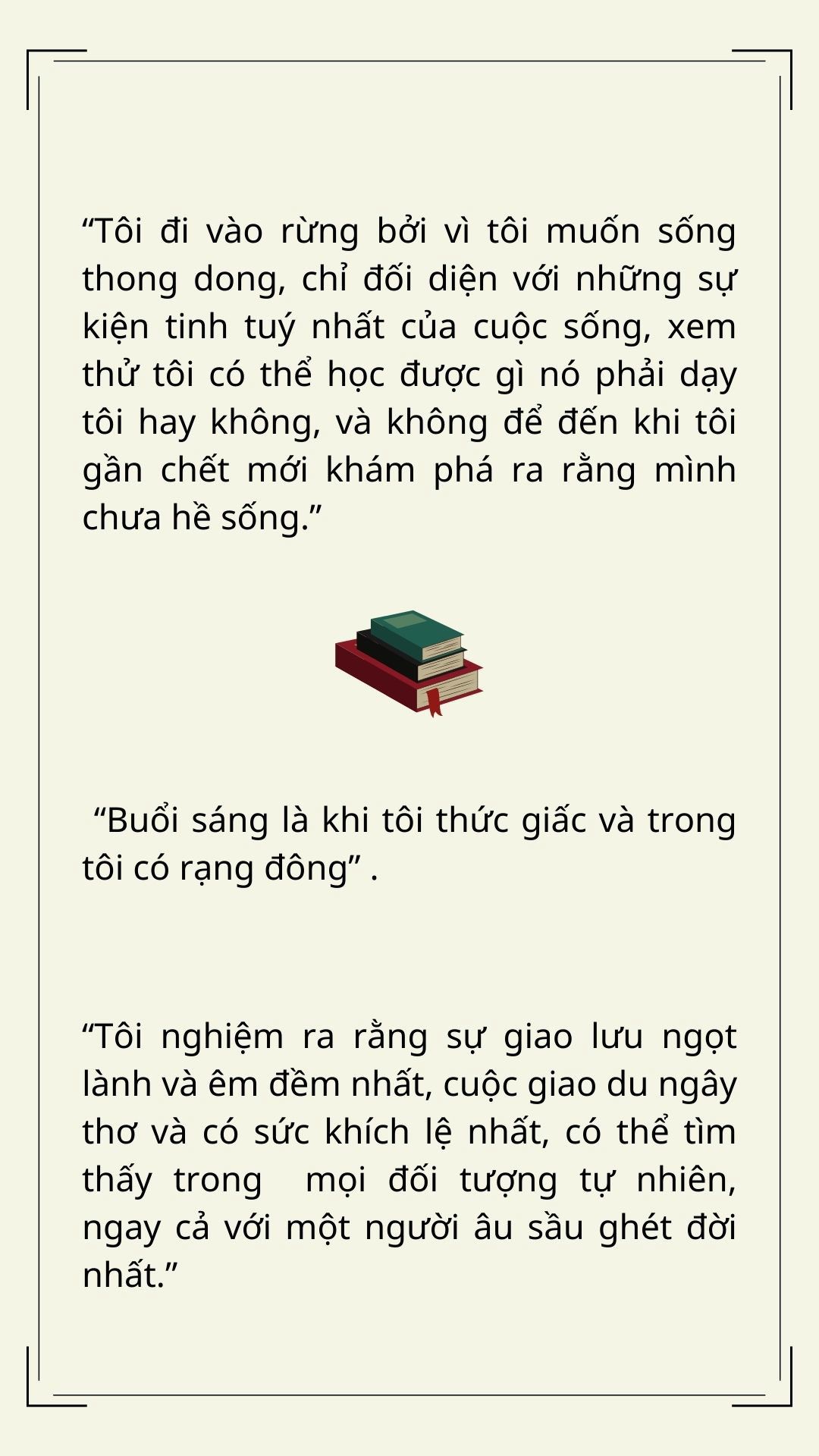 Bạn đọc sẽ tìm thấy nhiều chủ đề thực sự gần gũi với cuộc sống hằng ngày của mình, cả những trăn trở mà con người trong xã hội văn minh thường vẫn đang “vật vã” tự hỏi, tự trả lời. Có điều, nó được nhìn nhận và chưng cất bằng bộ lọc của một triết gia với quan điểm “yêu sự thông thái đến mức sống theo những tiếng gọi của nó, một đời sống đơn giản, độc lập, cao thượng và tin tưởng.”